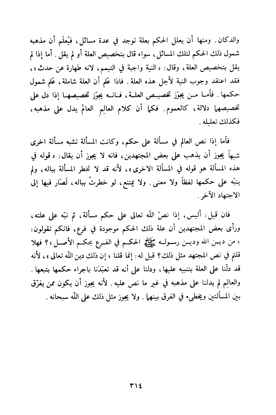 فان قيل أَلَيْسَ إِذا نَص الله تَعَالَى على حكم مَسْأَلَة ثمَّ نبه على علته وَرَأى بعض الْمُجْتَهدين أَن عِلّة ذَلِك الحكم مَوْجُودَة فِي فرع فانكم تَقولُونَ من دين الله وَدين رَسُوله صلى الله عَلَيْهِ وَسلم الحكم فِي الْفَرْع بِحكم الأَصْل فَهَلا قُلْتُمْ فِي نَص الْمُجْتَهد مثل ذَلِك قيل لَهُ إِنَّمَا قُلْنَا إِن ذَلِك دين الله تَعَالَى لِأَنَّهُ قد دلنا على الْعلَّة بتنبيه عَلَيْهَا ودلنا على أَنه قد تعبدنا باجراء حكمهَا بتبعها والعالم لم يدلنا على مذْهبه فِي غير مَا نَص عَلَيْهِ لِأَنَّهُ يجوز أَن يكون مِمَّن يفرق بَين الْمَسْأَلَتَيْنِ ويخطىء فِي الْفرق بَينهمَا وَلَا يجوز مثل ذَلِك على الله سُبْحَانَهُ
