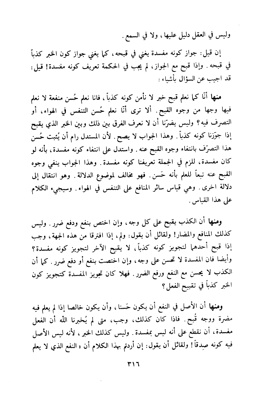 وَمِنْهَا أَن الْكَذِب يقبح على كل وَجه وَإِن اخْتصَّ بنفع وَدفع ضَرَر وَلَيْسَ كَذَلِك الْمَنَافِع والمضار وَلقَائِل أَن يَقُول وَلم إِذا افْتَرقَا من هَذِه الْجِهَة وَجب إِذا قبح أَحدهمَا لتجويز كَونه كذبا لَا يقبح الآخر لتجويز كَونه مفْسدَة وَأَيْضًا فان الْمفْسدَة لَا تحسن على وَجه وَإِن اخْتصّت بنفع أَو دفع ضَرَر كَمَا أَن الْكَذِب لَا يحسن مَعَ النَّفْع وَرفع الضَّرَر فَهَلا كَانَ تَجْوِيز الْمفْسدَة كتجويز كَون الْخَبَر كذبا فِي تقبيح الْفِعْل