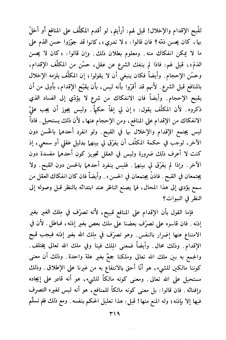 لقبح الْإِقْدَام والإخلال قيل لَهُم ارأيتم لَو أقدم الْمُكَلف على الْمَنَافِع أَو أخل بهَا كَانَ يحسن ذمه فان قَالُوا لَا نَدْرِي كَانُوا قد جوزوا حسن الذَّم على مَا لَا يُمكن انفكاك مِنْهُ وَمَعْلُوم بطلَان ذَلِك وَإِن قَالُوا كَانَ لَا يحسن الذَّم قيل لَهُم فاذا لم يَنْفَكّ الشَّرْع عَن عقل حسن من الْمُكَلف الْإِقْدَام وَحسن الإحجام وَأَيْضًا فَكَانَ يَنْبَغِي أَن لَا يَقُولُوا إِن الْمُكَلف يلْزمه الْإِخْلَال بالمنافع قبل الشَّرْع لأَنهم قد أقرُّوا بِأَنَّهُ لَيْسَ بِأَن يقبح الْإِقْدَام بِأولى من أَن يقبح الإحجام وَأَيْضًا فان الانفكاك من شرع لَا يُؤَدِّي إِلَى الْفساد الَّذِي ذَكرُوهُ لِأَن الْمُكَلف يَقُول إِن لي إِلَهًا حكيما وَلَيْسَ يجوز أَن يجب عَليّ الانفكاك من الْإِقْدَام على الْمَنَافِع وَمن الإحجام عَنْهَا لِأَن ذَلِك يَسْتَحِيل فاذا لَيْسَ يجْتَمع الْإِقْدَام والإخلال بهَا فِي الْقبْح وَلَو انْفَرد أَحدهمَا بالْحسنِ دون الآخر لوَجَبَ فِي حِكْمَة الْمُكَلف أَن يفرق لي بَينهمَا بِدَلِيل عَقْلِي أَو سَمْعِي إِذْ كنت لَا أعرف ذَلِك ضَرُورَة وَلَيْسَ فِي الْعقل تَجْوِيز كَون أَحدهمَا مفْسدَة دون الآخر وَإِذا لم يفرق لي بَينهمَا فَلَيْسَ ينْفَرد أَحدهمَا بالْحسنِ دون الْقبْح وَلَا يَجْتَمِعَانِ فِي الْقبْح فاذن يَجْتَمِعَانِ فِي الْحسن وَأَيْضًا فان كَانَ انفكاك الْعقل من سمع يُؤَدِّي إِلَى هَذَا الْمحَال فَمَا يصنع النَّاظر عِنْد ابْتِدَائه بِالنّظرِ قبل وُصُوله إِلَى النّظر فِي النبوات