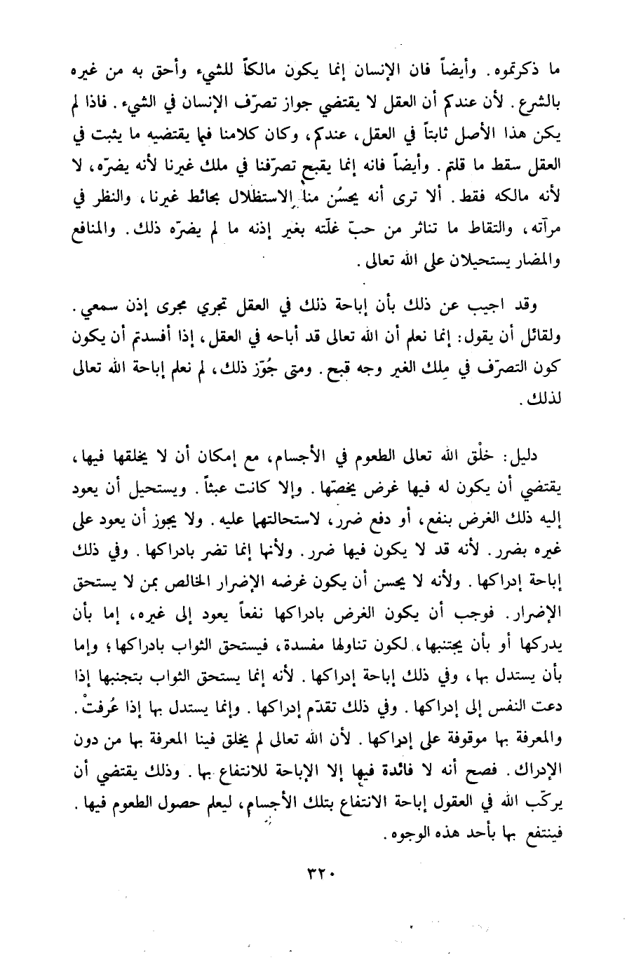 مَا ذكرتموه وَأَيْضًا فان الْإِنْسَان إِنَّمَا يكون مَالِكًا للشَّيْء وأحق بِهِ من غَيره بِالشَّرْعِ لِأَن عنْدكُمْ أَن الْعقل لَا يَقْتَضِي جَوَاز تصرف الْإِنْسَان فِي الشَّيْء فاذا لم يكن هَذَا الأَصْل ثَابتا فِي الْعقل عنْدكُمْ وَكَانَ كلامنا فِيمَا يَقْتَضِيهِ مَا يثبت فِي الْعقل سقط مَا قُلْتُمْ وَأَيْضًا فانه إِنَّمَا يقبح تصرفنا فِي ملك غَيرنَا لِأَنَّهُ يضرّهُ لَا لِأَنَّهُ مَالِكه فَقَط أَلا ترى أَنه يحسن منا الاستظلال بحائط غَيرنَا وَالنَّظَر فِي مرآته والتقاط مَا تناثر من حب غَلَّته بِغَيْر إِذْنه مَا لم يضرّهُ ذَلِك وَالْمَنَافِع والمضار يستحيلان على الله تَعَالَى