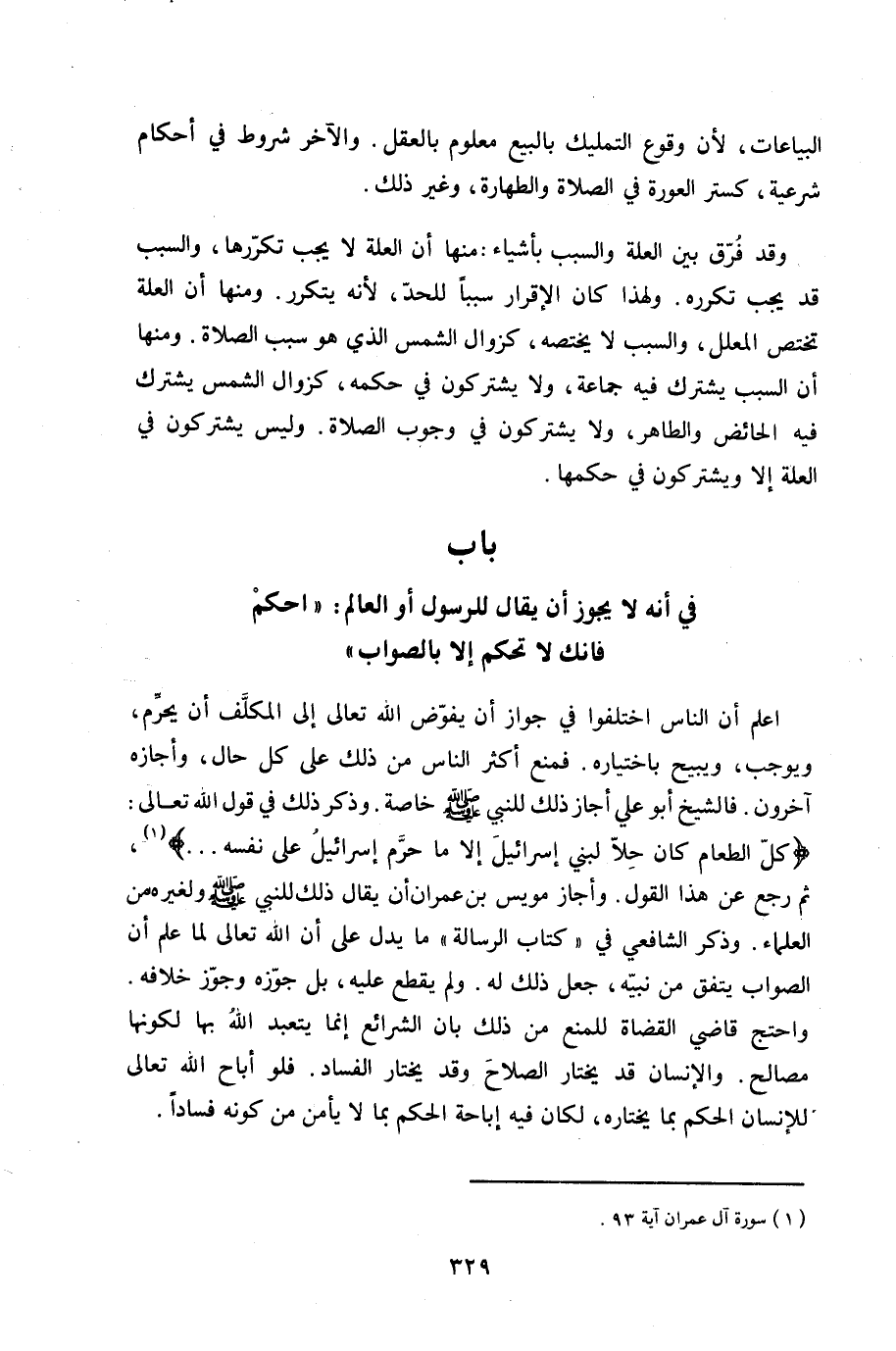 وَقد فرق بَين الْعلَّة وَالسَّبَب بأَشْيَاء مِنْهَا أَن الْعلَّة لَا يجب تكررها وَالسَّبَب قد يجب تكرره وَلِهَذَا كَانَ الْإِقْرَار سَببا للحد لِأَنَّهُ يتَكَرَّر وَمِنْهَا أَن الْعلَّة تخْتَص الْمُعَلل وَالسَّبَب لَا يختصه كزوال الشَّمْس الَّذِي هُوَ سَبَب الصَّلَاة وَمِنْهَا أَن السَّبَب يشْتَرك فِي جمَاعَة وَلَا يشتركون فِي حكمه كزوال الشَّمْس يشْتَرك فِيهِ الْحَائِض والطاهر وَلَا يشتركون فِي وجوب الصَّلَاة وَلَيْسَ يشتركون فِي الْعلَّة إِلَّا ويشتركون فِي حكمهَا - صَلَّى اللَّهُ عَلَيْهِ وَسَلَّم َ - بَاب فِي أَنه لَا يجوز أَن يُقَال للرسول أَو الْعَالم احكم فانك لَا تحكم إِلَّا بِالصَّوَابِ - صَلَّى اللَّهُ عَلَيْهِ وَسَلَّم َ -