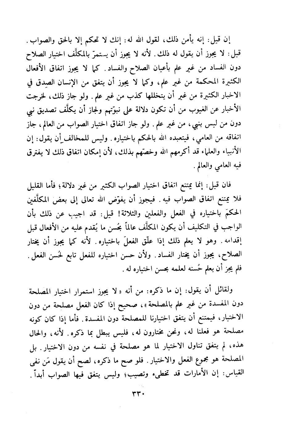 إِن قيل إِنَّه يَأْمَن ذَلِك لقَوْل الله لَهُ إِنَّك لَا تحكم إِلَّا بِالْحَقِّ وَالصَّوَاب قيل لَا يجوز أَن يَقُول لَهُ ذَلِك لِأَنَّهُ لَا يجوز أَن يسْتَمر بالمكلف اخْتِيَار الصّلاح دون الْفساد من غير علم بأعيان الصّلاح وَالْفساد كَمَا لَا يجوز اتِّفَاق الْأَفْعَال الْكَثِيرَة المحكمة من غير علم وكما لَا يجوز أَن يتَّفق من الْإِنْسَان الصدْق فِي الْأَخْبَار الْكَثِيرَة من غير أَن يتخللها كذب من غير علم وَلَو جَازَ ذَلِك لَخَرَجت الْأَخْبَار عَن الغيوب من أَن تكون دلَالَة على نبوتهم ولجاز أَن يُكَلف تَصْدِيق نَبِي دون من لَيْسَ بِنَبِي من غير علم وَلَو جَازَ اتِّفَاق اخْتِيَار الصَّوَاب من الْعَالم جَازَ اتفاقه من الْعَاميّ فيتعبده الله بالحكم بِاخْتِيَارِهِ وَلَيْسَ للمخالف أَن يَقُول إِن الْأَنْبِيَاء وَالْعُلَمَاء قد أكْرمهم الله وخصهم بذلك لِأَن إِمْكَان اتِّفَاق ذَلِك لَا يفْتَرق فِيهِ الْعَاميّ والعالم