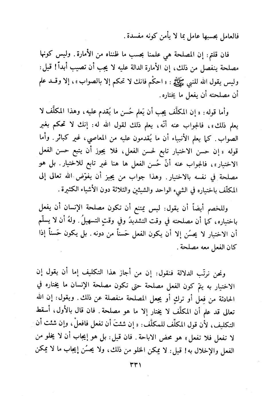 فان قُلْتُمْ إِن الْمصلحَة هِيَ علمنَا بِحَسب مَا ظنناه من الأمارة وَلَيْسَ كَونهَا مصلحَة ينْفَصل من ذَلِك إِن الأمارة الدَّالَّة عَلَيْهِ لَا يجب ان تصيب ابدا قيل وَلَيْسَ يَقُول الله للنَّبِي صلى الله عَلَيْهِ وَسلم احكم فانك لَا تحكم إِلَّا بِالصَّوَابِ إِلَّا وَقد علم أَن مصْلحَته أَن يفعل مَا يختاره