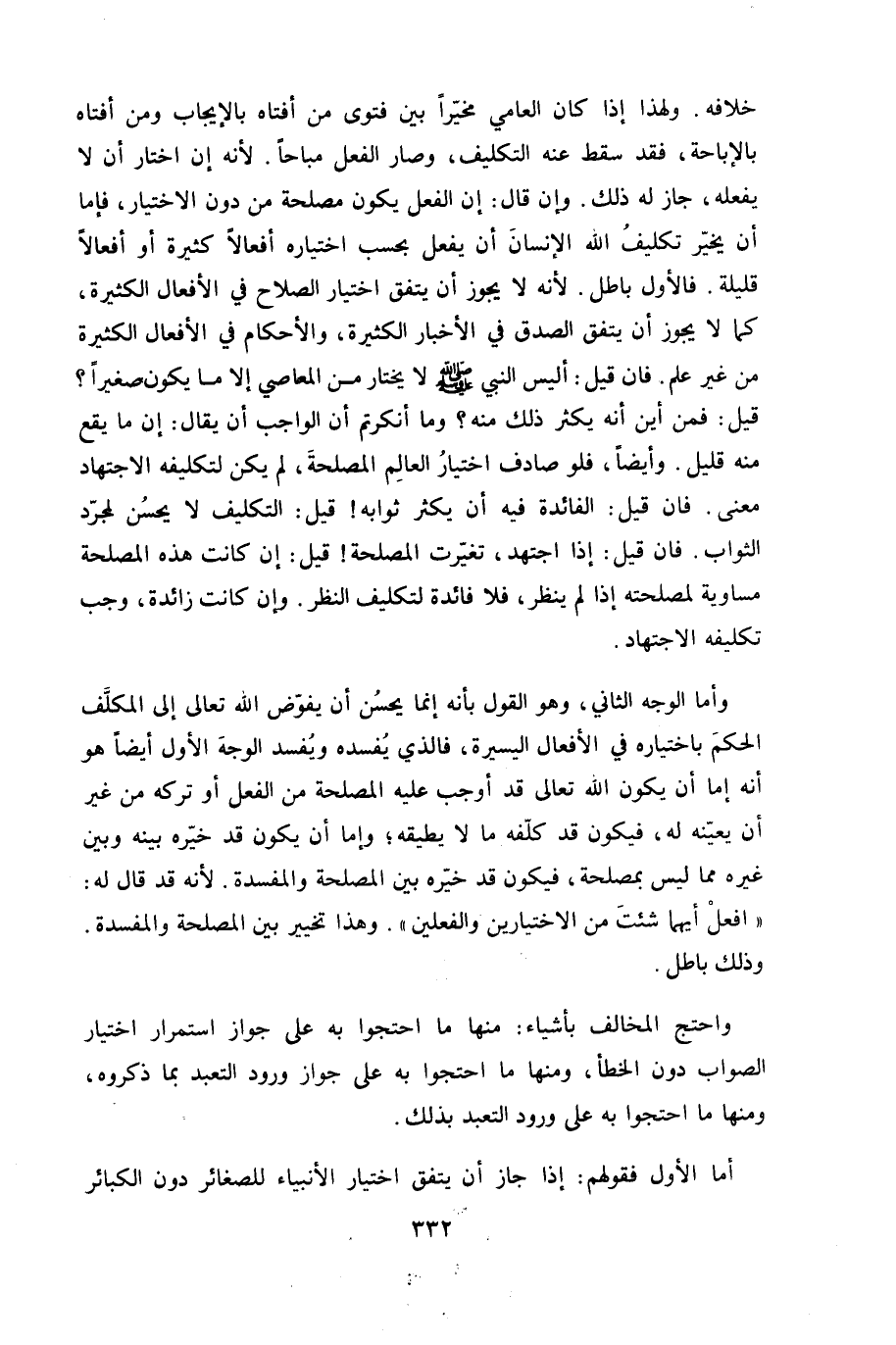 خِلَافه وَلِهَذَا إِذا كَانَ الْعَاميّ مُخَيّرا بَين فَتْوَى من أفتاه بِالْإِيجَابِ وَمن أفتاه بِالْإِبَاحَةِ فقد سقط عَنهُ التَّكْلِيف وَصَارَ الْفِعْل مُبَاحا لِأَنَّهُ إِن اخْتَار أَن لَا يَفْعَله جَازَ لَهُ ذَلِك وَإِن قَالَ إِن الْفِعْل يكون مصلحَة من دون الِاخْتِيَار فإمَّا أَن يُخَيّر تَكْلِيف الله الْإِنْسَان أَن يفعل بِحَسب اخْتِيَاره أفعالا كَثِيرَة أَو أفعالا قَليلَة فَالْأول بَاطِل لِأَنَّهُ لَا يجوز أَن يتَّفق اخْتِيَار الصّلاح فِي الْأَفْعَال الْكَثِيرَة كَمَا لَا يجوز أَن يتَّفق الصدْق فِي الْأَخْبَار الْكَثِيرَة وَالْأَحْكَام فِي الْأَفْعَال الْكَثِيرَة من غير علم فان قيل أَلَيْسَ النَّبِي صلى الله عَلَيْهِ وَسلم لَا يخْتَار من الْمعاصِي إِلَّا مَا يكون صَغِيرا قيل فَمن أَيْن أَنه يكثر ذَلِك مِنْهُ وَمَا أنكرتم ان الْوَاجِب أَن يُقَال إِن مَا يَقع مِنْهُ قَلِيل وَأَيْضًا فَلَو صَادف اخْتِيَار الْعَالم الْمصلحَة لم يكن لتكليفه الِاجْتِهَاد معنى فان قيل الْفَائِدَة فِيهِ أَن يكثر ثَوَابه قيل التَّكْلِيف لَا يحسن لمُجَرّد الثَّوَاب فان قيل إِذا اجْتهد تَغَيَّرت الْمصلحَة قيل إِن كَانَت هَذِه الْمصلحَة مُسَاوِيَة لمصلحته إِذا لم ينظر فَلَا فَائِدَة لتكليف النّظر وَإِن كَانَت زَائِدَة وَجب تَكْلِيفه الِاجْتِهَاد