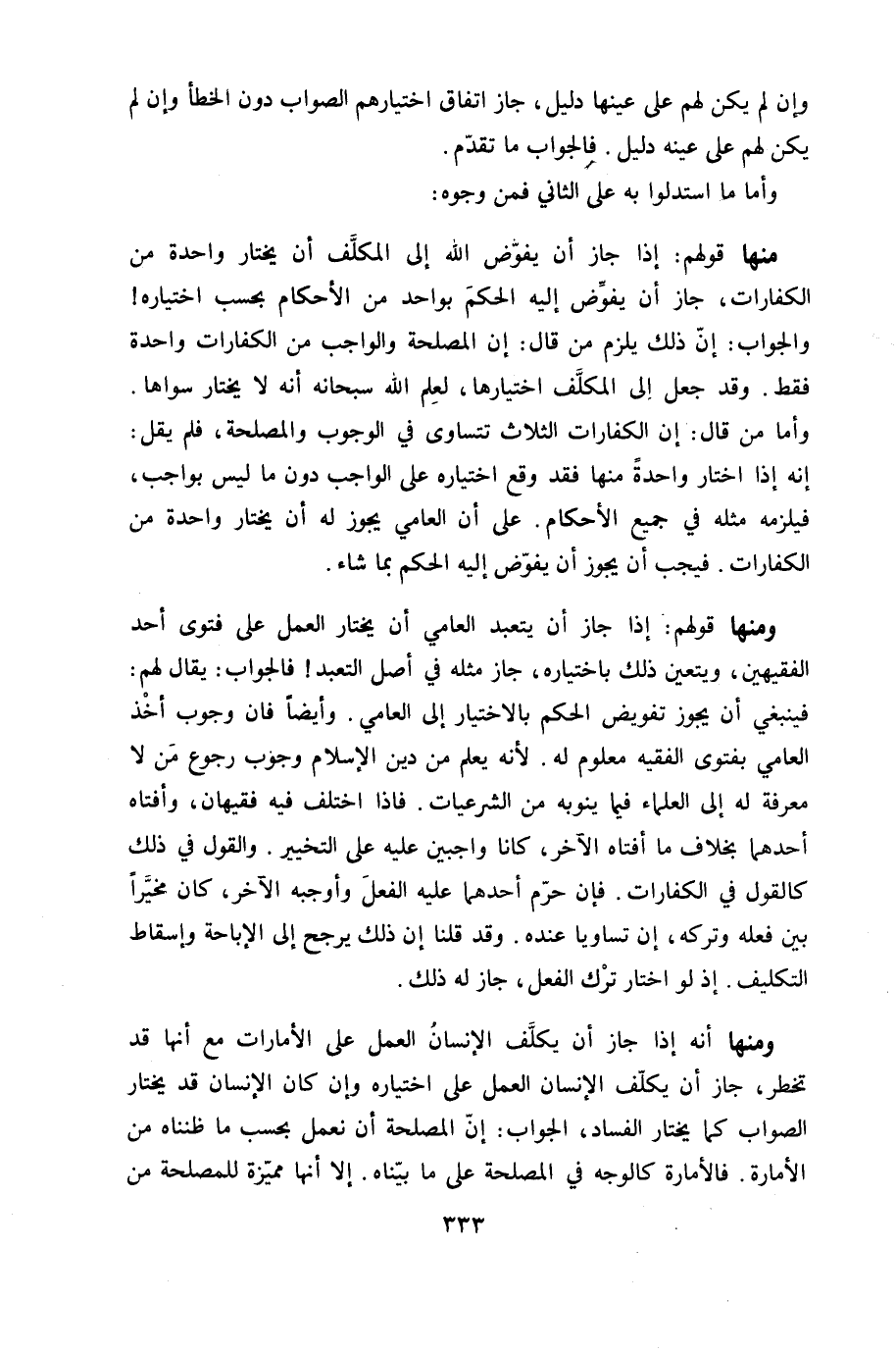 مِنْهَا قَوْلهم إِذا جَازَ أَن يُفَوض الله إِلَى الْمُكَلف أَن يخْتَار وَاحِدَة من الْكَفَّارَات جَازَ أَن يُفَوض إِلَيْهِ الحكم بِوَاحِد من الْأَحْكَام بِحَسب اخْتِيَاره وَالْجَوَاب إِن ذَلِك يلْزم من قَالَ إِن الْمصلحَة وَالْوَاجِب من الْكَفَّارَات وَاحِدَة فَقَط وَقد جعل إِلَى الْمُكَلف اخْتِيَارهَا لعلم الله سُبْحَانَهُ أَنه لَا يخْتَار سواهَا واما من قَالَ إِن الْكَفَّارَات الثَّلَاث تتساوى فِي الْوُجُوب والمصلحة فَلم يقل إِنَّه إِذا اخْتَار وَاحِدَة مِنْهَا فقد وَقع اخْتِيَاره على الْوَاجِب دون مَا لَيْسَ بِوَاجِب فَيلْزمهُ مثله فِي جَمِيع الْأَحْكَام على أَن الْعَاميّ يجوز لَهُ ان يخْتَار وَاحِدَة من الْكَفَّارَات فَيجب أَن يجوز أَن يُفَوض إِلَيْهِ الحكم بِمَا شَاءَ