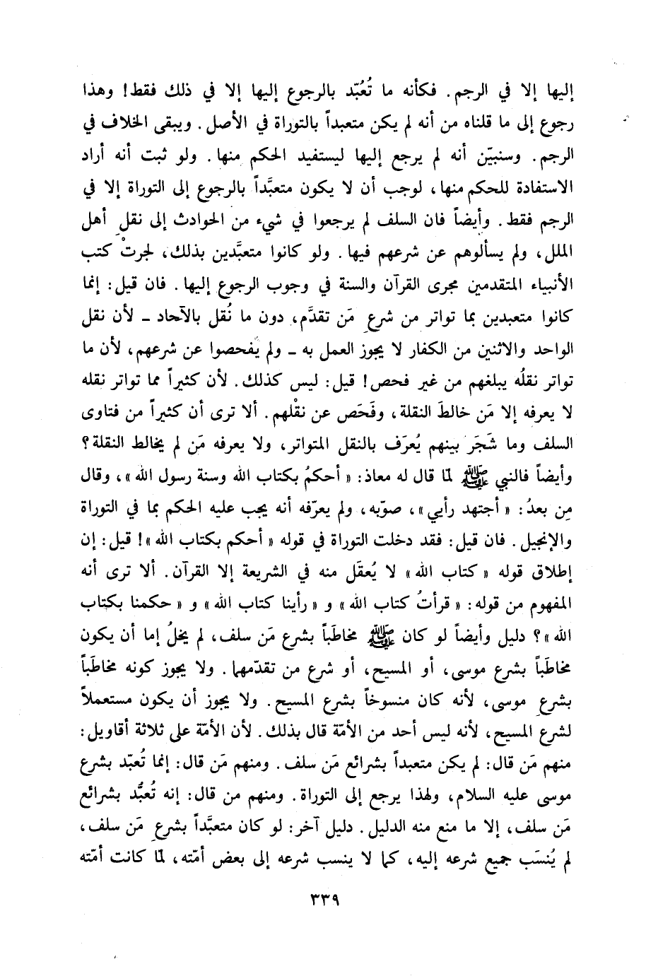 إِلَيْهَا إِلَّا فِي الرَّجْم فَكَانهُ مَا تعبد بِالرُّجُوعِ إِلَيْهَا إِلَّا فِي ذَلِك فَقَط وَهَذَا رُجُوع إِلَى مَا قُلْنَاهُ من أَنه لم يكن متعبدا بِالتَّوْرَاةِ فِي الأَصْل وَيبقى الْخلاف فِي الرَّجْم وسنبين أَنه لم يرجع إِلَيْهَا ليستفيد الحكم مِنْهَا وَلَو ثَبت أَنه أَرَادَ الاستفادة للْحكم مِنْهَا لوَجَبَ أَن لَا يكون متعبدا بِالرُّجُوعِ إِلَى التَّوْرَاة إِلَّا فِي الرَّجْم فَقَط وَأَيْضًا فان السّلف لم يرجِعوا فِي شَيْء من الْحَوَادِث إِلَى نقل أهل الْملَل وَلم يسألوهم عَن شرعهم فِيهَا وَلَو كَانُوا متعبدين بذلك لجرت كتب الْأَنْبِيَاء الْمُتَقَدِّمين مجْرى الْقُرْآن وَالسّنة فِي وجوب الرُّجُوع إِلَيْهَا فان قيل إِنَّمَا كَانُوا متعبدين بِمَا تَوَاتر من شرع من تقدم دون مَا نقل بالآحاد لِأَن نقل الْوَاحِد والاثنين من الْكفَّار لَا يجوز الْعَمَل بِهِ وَلم يفحصوا عَن شرعهم لِأَن مَا تَوَاتر نَقله يبلغهم من غير فحص قيل لَيْسَ كَذَلِك لِأَن كثيرا مِمَّا تَوَاتر نَقله لَا يعرفهُ إِلَّا من خالط النقلَة وفحص عَن نقلهم أَلا ترى أَن كثيرا من فَتَاوَى السّلف وَمَا شجر بَينهم يعرف بِالنَّقْلِ الْمُتَوَاتر وَلَا يعرفهُ من لم يخالط النقلَة وَأَيْضًا فالنبي صلى الله عَلَيْهِ وَسلم لما قَالَ لَهُ معَاذ أحكم بِكِتَاب الله وَسنة رَسُول الله وَقَالَ من بعد أجتهد رَأْيِي صَوبه وَلم يعرفهُ أَنه يجب عَلَيْهِ الحكم بِمَا فِي التوارة وَالْإِنْجِيل فان قيل فقد دخلت التَّوْرَاة فِي قَوْله أحكم بِكِتَاب الله قيل إِن إِطْلَاق قَوْله كتاب الله لَا يعقل مِنْهُ فِي الشَّرِيعَة إِلَّا الْقُرْآن أَلا ترى أَنه الْمَفْهُوم من قَوْله قَرَأت كتاب الله ورأينا كتاب الله وحكمنا بِكِتَاب الله دَلِيل وَأَيْضًا لَو كَانَ صلى الله عَلَيْهِ وَسلم مُخَاطبا بشرع من سلف لم يخل إِمَّا أَن يكون مُخَاطبا بشرع مُوسَى أَو الْمَسِيح أَو شرع من تقدمهما وَلَا يجوز كَونه مُخَاطبا بشرع مُوسَى لِأَنَّهُ كَانَ مَنْسُوخا بشرع الْمَسِيح وَلَا يجوز أَن يكون مُسْتَعْملا لشرع الْمَسِيح لِأَنَّهُ لَيْسَ اُحْدُ من الْأمة قَالَ بذلك لِأَن الْأمة على ثَلَاثَة أقاويل مِنْهُم من قَالَ لم يكن متعبدا بشرائع من سلف وَمِنْهُم من قَالَ إِنَّمَا تعبد بشرع مُوسَى عَلَيْهِ السَّلَام وَلِهَذَا يرجع إِلَى التَّوْرَاة وَمِنْهُم قَالَ إِنَّه تعبد بشرائع من سلف إِلَّا مَا منع مِنْهُ الدَّلِيل دَلِيل آخر لَو كَانَ متعبدا بشرع من سلف لم ينْسب جَمِيع شَرعه إِلَيْهِ كَمَا لَا ينْسب شَرعه إِلَى بعض أمته لما كَانَت أمته