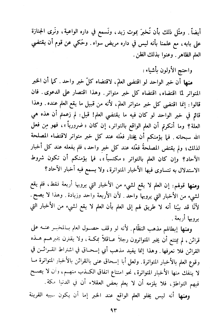 مِنْهَا أَن خبر الْوَاحِد لَو اقْتضى الْعلم لاقتضاه كل خبر وَاحِد كَمَا أَن الْخَبَر الْمُتَوَاتر لما اقْتَضَاهُ اقْتَضَاهُ كل خبر متواتر وَهَذَا اقْتِصَار على الدَّعْوَى فان قَالُوا إِنَّمَا اقْتضى كل خبر متواتر الْعلم لِأَنَّهُ من قبيل مَا يَقع الْعلم عِنْده وَهَذَا قَائِم فِي خبر الْوَاحِد لَو كَانَ فِيهِ مَا يَقْتَضِي الْعلم قيل لم زعمتم أَن هَذِه هِيَ الْعلَّة وَمَا انكرتم أَن الْعلم الْوَاقِع بالتواتر إِن كَانَ ضَرُورِيًّا فَهُوَ من فعل الله سُبْحَانَهُ فَمَا يؤمنكم أَن يخْتَار فعله عِنْد كل خبر متواتر لاقْتِضَاء الْمصلحَة لذَلِك وَلم يقتض الْمصلحَة فعله عِنْد كل خبر وَاحِد فَلم يَفْعَله عِنْد كل أَخْبَار الْآحَاد وَإِن كَانَ الْعلم بالتواتر مكتسبا فَمَا يؤمنكم أَن تكون شُرُوط الِاسْتِدْلَال بِهِ تتساوى فِيهَا الْأَخْبَار المتواترة وَلَا يسمع فِيهِ أَخْبَار الْآحَاد