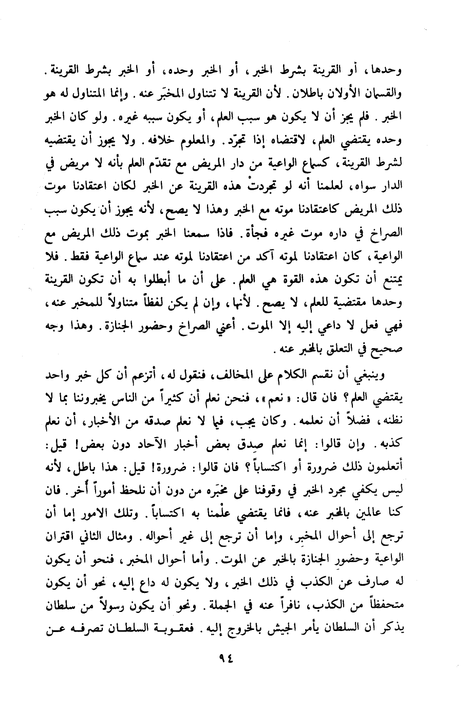 وَيَنْبَغِي أَن نقسم الْكَلَام على الْمُخَالف فَنَقُول بِهِ أتزعم أَن كل خبر وَاحِد يَقْتَضِي الْعلم فان قَالَ نعم فَنحْن نعلم أَن كثيرا من النَّاس يخبروننا بِمَا لَا نظنه فضلا أَن نعلمهُ وَكَانَ يجب فِيمَا لَا نعلم صدقه من الْأَخْبَار أَن نعلم كذبه وَإِن قَالُوا إِنَّمَا نعلم صدق بعض أَخْبَار الْآحَاد دون بعض قيل أتعلمون ذَلِك ضَرُورَة أَو اكتسابا فان قَالُوا ضَرُورَة قيل هَذَا بَاطِل لِأَنَّهُ لَيْسَ يَكْفِي مُجَرّد الْخَبَر فِي وقوفنا على مخبره من دون أَن نلحظ أمورا أخر فان كُنَّا عَالمين بالمخبر عَنهُ فانما يَقْتَضِي علمنَا بِهِ اكتسابا وَتلك الامور إِمَّا أَن ترجع إِلَى احوال الْمخبر وَإِمَّا أَن ترجع إِلَى غير احواله وَمِثَال الثَّانِي اقتران الواعية وَحُضُور الْجِنَازَة بالْخبر عَن الْمَوْت وَأما أَحْوَال الْمخبر فنحو أَن يكون لَهُ صَارف عَن الْكَذِب فِي ذَلِك الْخَبَر وَلَا يكون لَهُ دَاع إِلَيْهِ نَحْو أَن يكون متحفظا من الْكَذِب نافرا عَنهُ فِي الْجُمْلَة وَنَحْو أَن يكون رَسُولا من سُلْطَان يذكر أَن السطان يَأْمر الْجَيْش بِالْخرُوجِ إِلَيْهِ فعقوبة السُّلْطَان تصرفه عَن