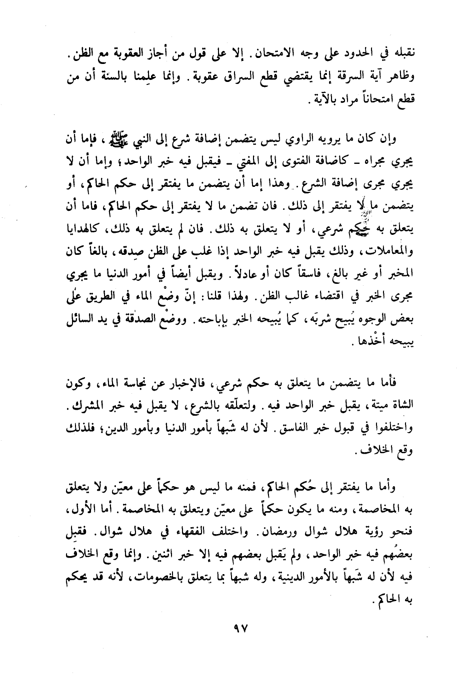 نقبله فِي الْحُدُود على وَجه الامتحان إِلَّا على قَول من أجَاز الْعقُوبَة مَعَ الظَّن وَظَاهر آيَة السّرقَة إِنَّمَا يَقْتَضِي قطع السراق عُقُوبَة وَإِنَّمَا علمنَا بِالسنةِ أَن من قطع امتحانا مُرَاد بِالْآيَةِ