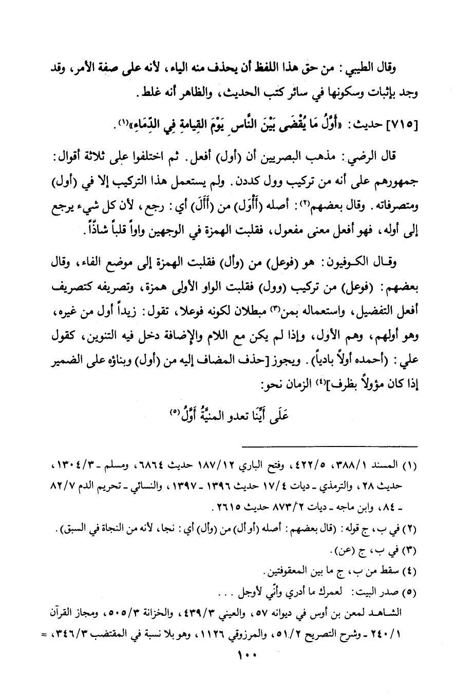 وقال الكوفيون: هو (فوعل) من (وأل) فقلبت الهمزة إلى موضع الفاء، وقال بعضهم: (فوعل) من تركيب (وول) فقلبت الواو الأولى همزة، وتصريفه كتصريف أفعل التفضيل، واستعماله بمن مبطلان لكونه فوعلا، تقول: زيدًا أول من غيره، وهو أولهم، وهم الأول، وإذا لم يكن مع اللام والإضافة دخل فيه التنوين، كقول علي: (أحمده أولاً باديًا). ويجوز [حذف المضاف إليه من (أول) وبناؤه على الضمير إذا كان مؤولاً بظرف] الزمان نحو: