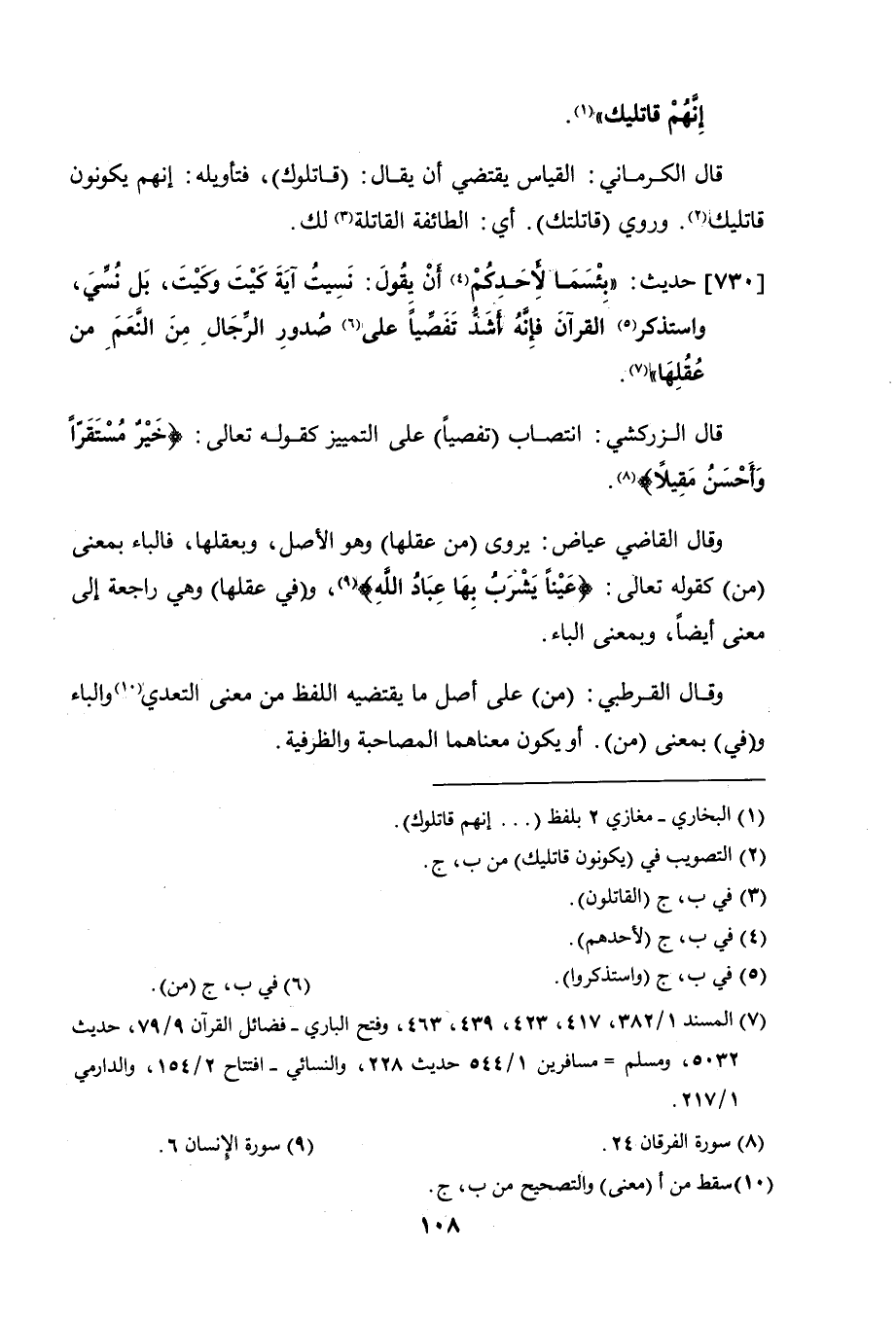 قال الكرماني: القياس يقتضي أن يقال: (قاتلوك)، فتأويله: إنهم يكونون قاتليك. وروي (قاتلتك). أي: الطائفة القاتلة لك.