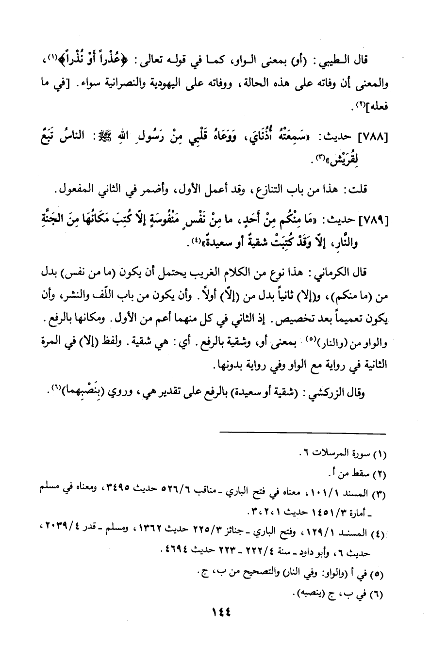 قال الكرماني: هذا نوع من الكلام الغريب يحتمل أن يكون (ما من نفس) بدل من (ما منكم)، و (إلا) ثانيًا بدل من (إلاّ) أولاً. وأن يكون من باب اللّف والنشر، وأن يكون تعميمًا بعد تخصيص. إذ الثاني في كل منهما أعم من الأول. ومكانها بالرفع. والواو من (والنار) بمعنى أو، وشقية بالرفع. أي: هي شقية. ولفظ (إلا) في المرة الثانية في رواية مع الواو وفي رواية بدونها.