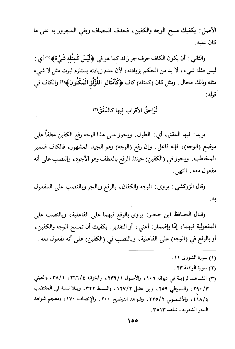 وقال الحافظ ابن حجر: يروى بالرفع فيهما على الفاعلية، وبالنصب على المفعولية فيهما، إمّا بإضمار: أعني، أو التقدير: يكفيك أن تمسح الوجه والكفين، أو بالرفع في (الوجه) على الفاعلية، وبالنصب في (الكفين) على أنه مفعول معه.