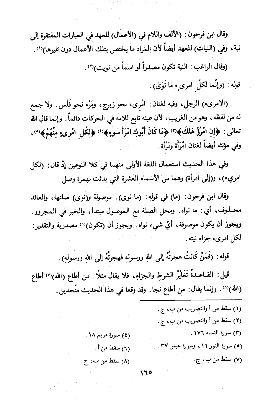 وقال ابن فرحون: (الألف واللام) في (الأعمال) للعهد في العبارات المفتقرة إلى نية، وفي (النيات) للعهد أيضًا لأن المراد ما يختص بتلك الأعمال دون غيرها).
