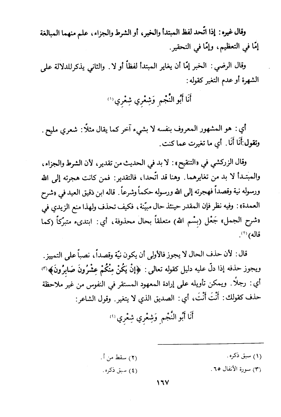 وقال الزركشي في "التنقيح": لا بد في الحديث من تقدير، لأن الشرط والجزاء، والمبتدأ لا بد من تغايرهما. وهنا قد اتّحدا، فالتقدير: فمن كانت هجرته إلى الله ورسوله نية وقصدًا فهجرته إلى الله ورسوله حكمًا وشرعًا. قاله ابن دقيق العيد في "شرح العمدة": وفيه نظر فإن المقدر حينئذ حال مبيّنة، فكيف تحذف ولهذا منع الزيدي في "شرح الجمل" جعل (بسم الله) متعلقًا بحال محذوفة، أي: ابتدئ متبرّكًا (كما قاله).
