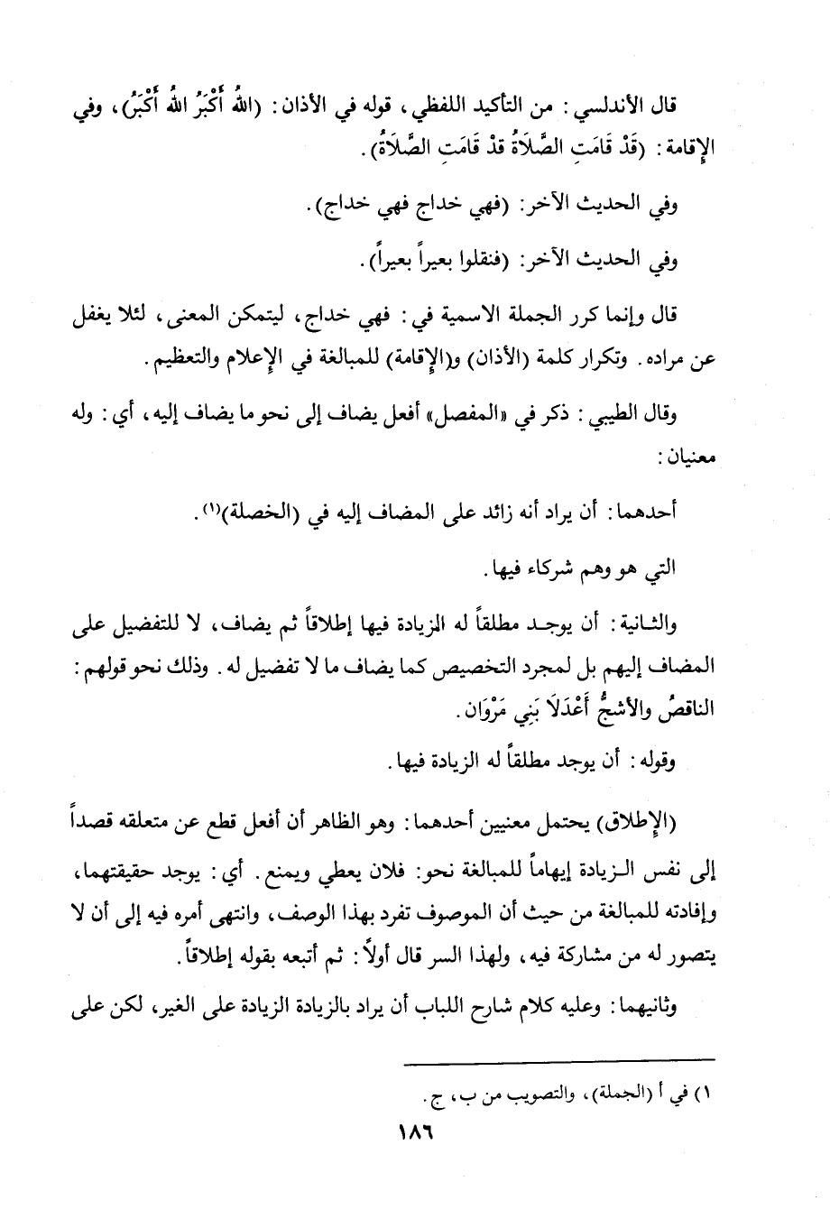 قال وإنما كرر الجملة الاسمية في: فهي خداج، ليتمكن المعنى، لئلا يغفل عن مراده. وتكرار كلمة (الأذان) و (الإقامة) للمبالغة في الإعلام والتعظيم.