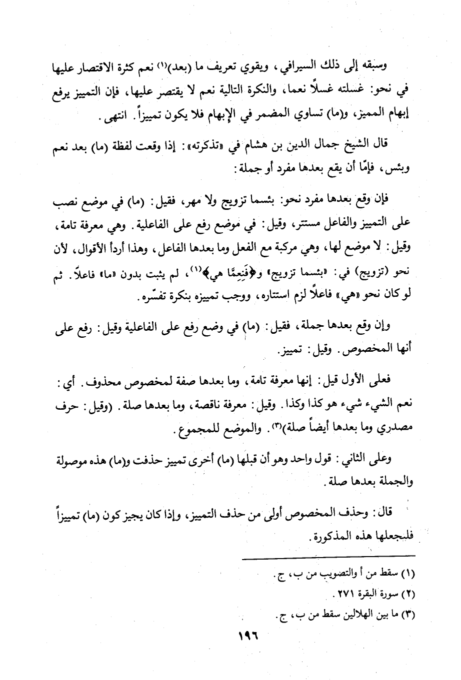 وسبقه إلى ذلك السيرافي، ويقوي تعريف ما (بعد) نعم كثيرة الاقتصار عليها في نحو: غسلته غسلاً نعما، والنكرة التالية نعم لا يقتصر عليها، فإن التمييز يرفع إبهام المميز، و (ما) تساوي المضمر في الإبهام فلا يكون تمييزًا. انتهى.
