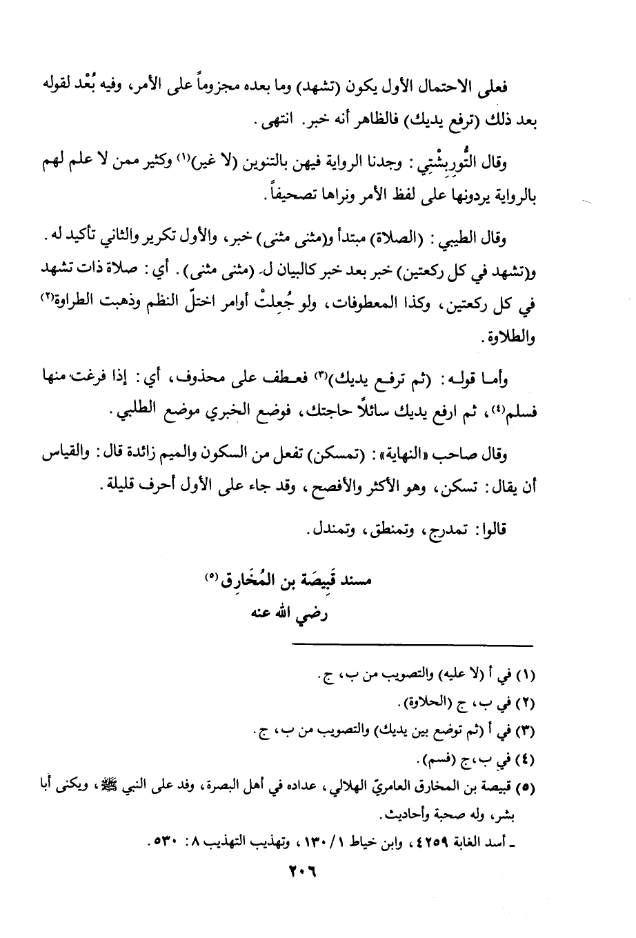 وقال الطيبي: (الصلاة) مبتدأ و (مثنى مثنى) خبر، والأول تكرير والثاني تأكيد له. و (تشهد في كل ركعتين) خبر بعد خبر كالبيان لـ (مثنى مثنى). أي: صلاة ذات تشهد في كل ركعتين، وكذا المعطوفات، ولو جعلت أوامر اختلّ النظم وذهبت الطراوة والطلاوة.