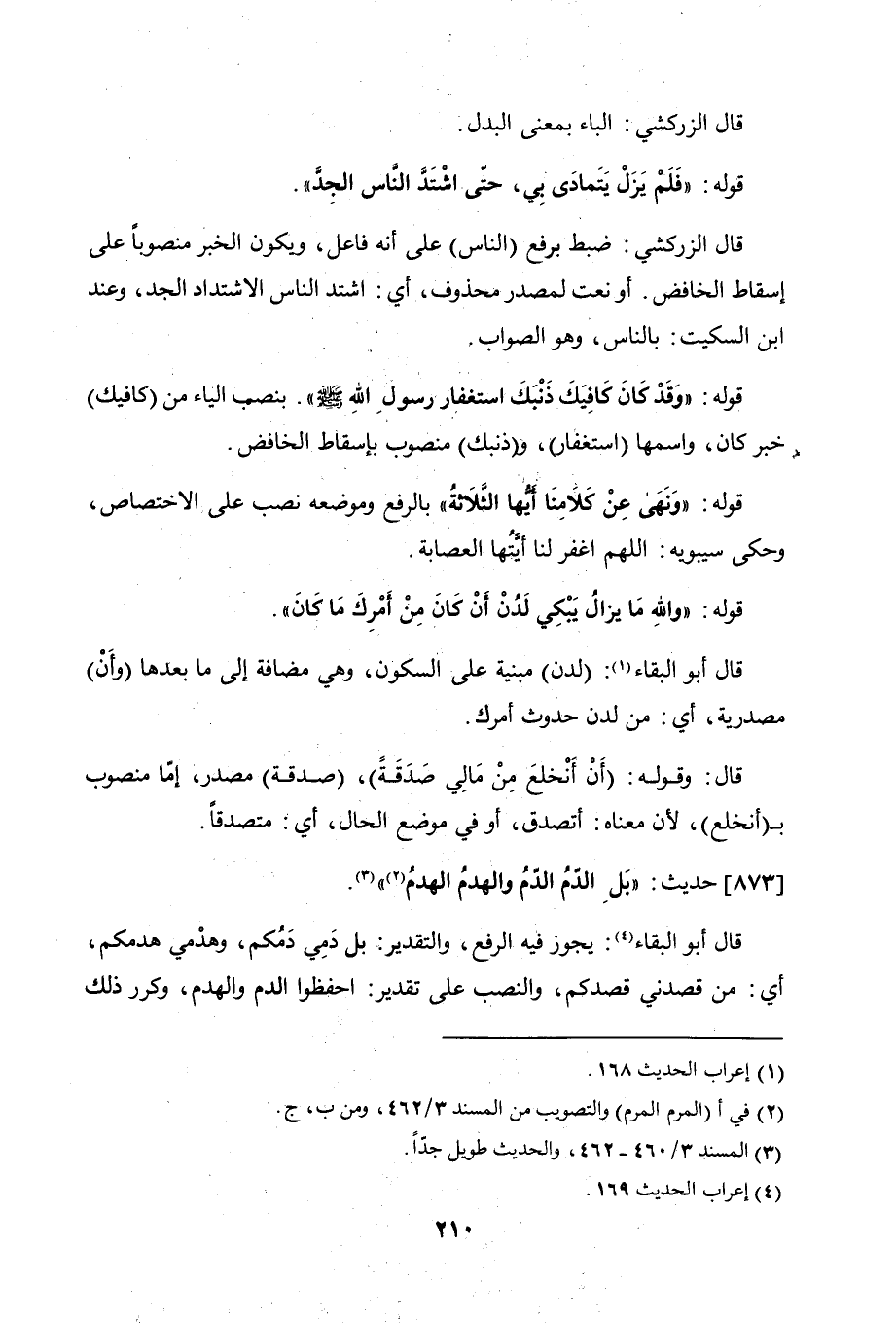قال الزركشي: ضبط برفع (الناس) على أنه فاعل، ويكون الخبر منصوبًا على إسقاط الخافض، أو نعت لمصدر محذوف، أي: اشتد الناس الاشتداد الجد، وعند ابن السكيت: بالناس، وهو الصواب.