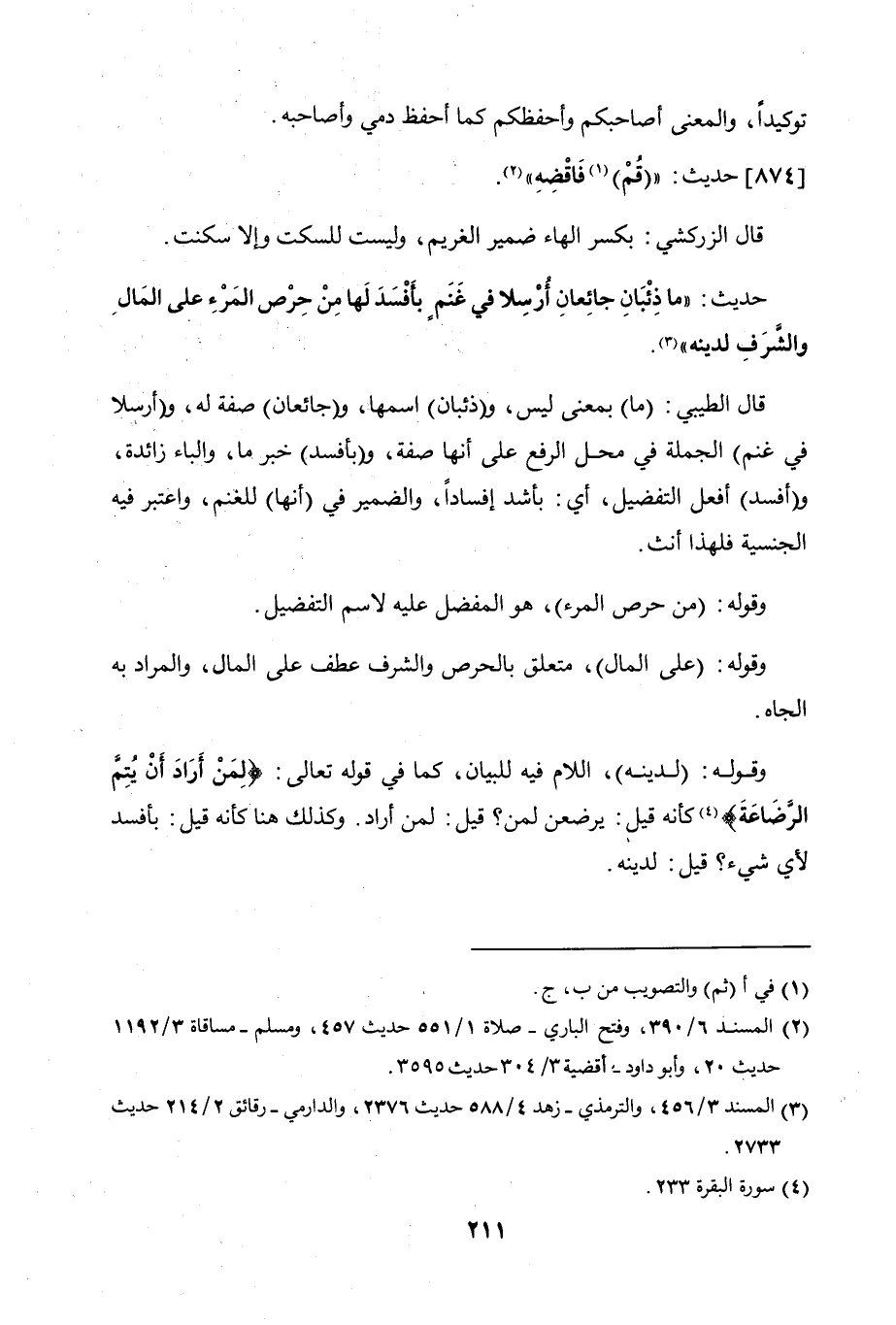 حديث: "ما ذئبان جائعان أرسلا في غنم بأفسد لها من حرص المرء على المال والشرف لدينه".