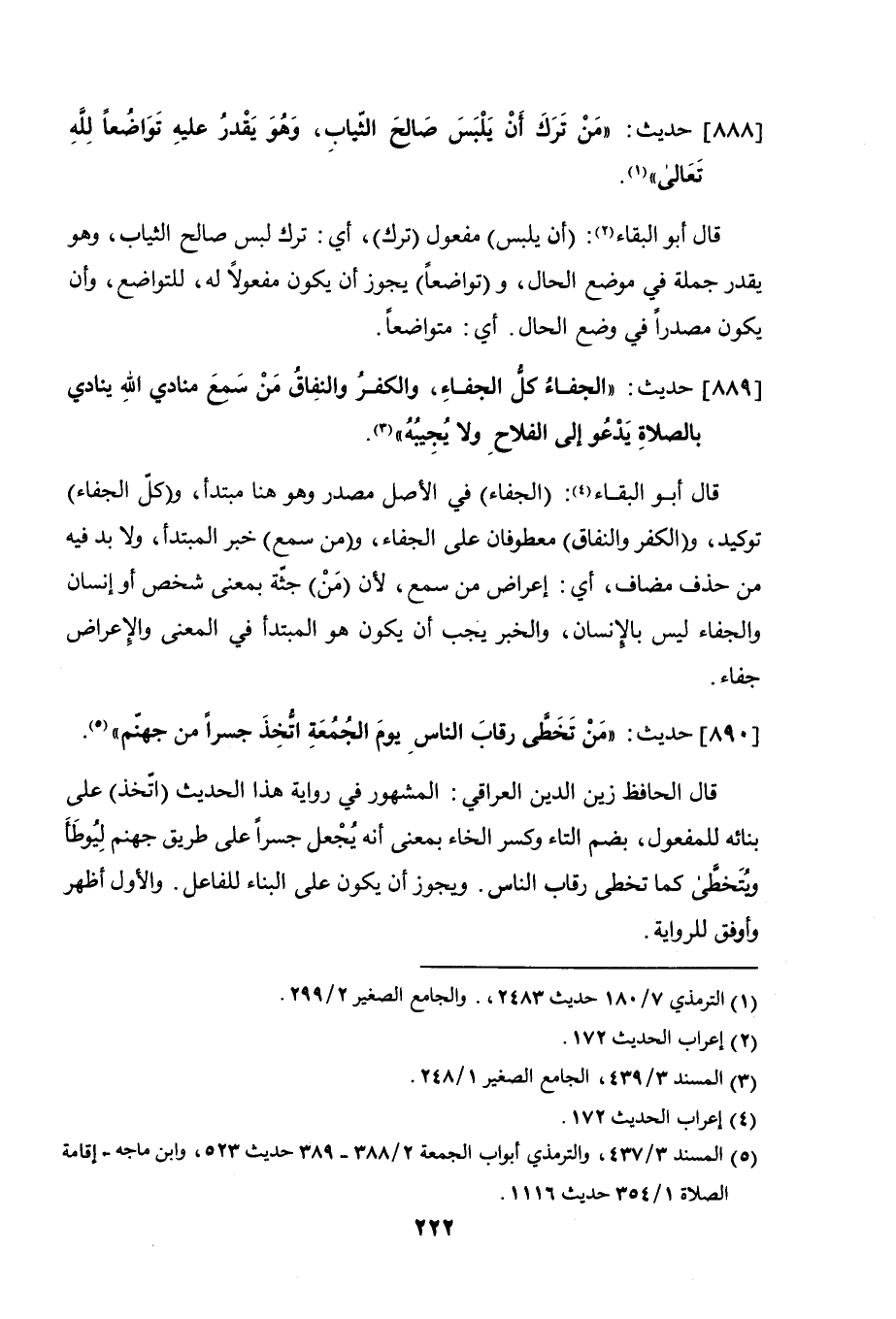 قال الحافظ زين الدين العراقي: المشهور في رواية هذا الحديث (اتّخذ) على بنائه للمفعول، بضم التاء وكسر الخاء بمعنى أنه يُجعل جسرًا على طريق جهنم ليوطأ ويُتَخطّى كما تخطى رقاب الناس. ويجوز أن يكون على البناء للفاعل. والأول أظهر وأوفق للرواية.