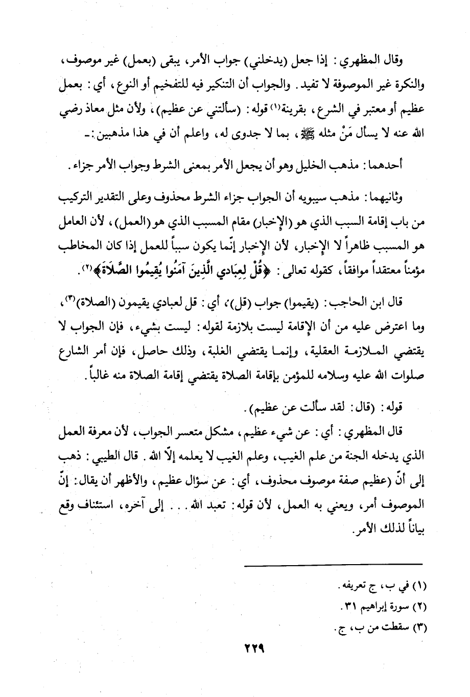 قال ابن الحاجب: (يقيموا) جواب (قل)، أي: قل لعبادي يقيمون (الصلاة)، وما اعترض عليه من أن الإقامة ليست بلازمة لقوله: ليست بشيء، فإن الجواب لا يقتضي الملازمة العقلية، وإنما يقتضي الغلبة، وذلك حاصل، فإن أمر الشارع صلوات الله عليه وسلامه للمؤمن بإقامة الصلاة يقتضي إقامة الصلاة منه غالبًا.