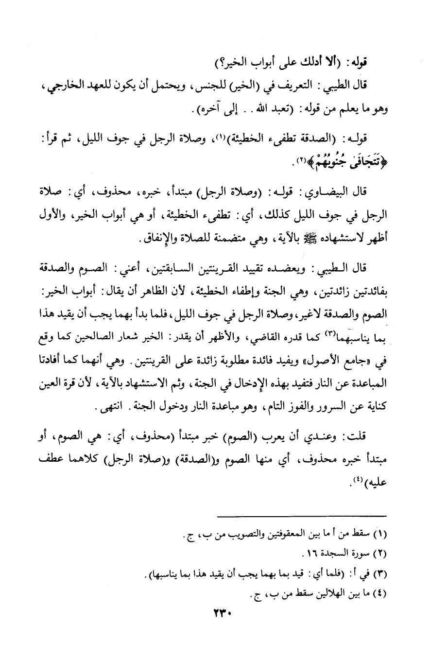 قال البيضاوي: قوله: (وصلاة الرجل) مبتدأ، خبره محذوف، أي: صلاة الرجل في جوف الليل كذلك، أي: تطفئ الخطيئة، أو هي أبواب الخير، والأول أظهر لاستشهاده صلى الله عليه وسلم بالآية، وهي متضمنة للصلاة والإنفاق.