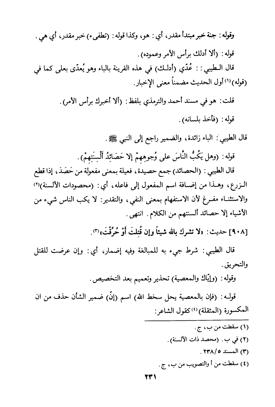 قوله: (وهل يَكُبُّ الناسَ على وجوههم إلا حصائدُ ألسنتهم).