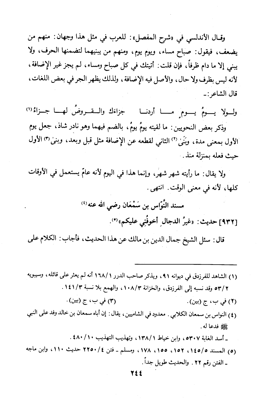 قال: سئل الشيخ جمال الدين بن مالك عن هذا الحديث، فأجاب: الكلام على