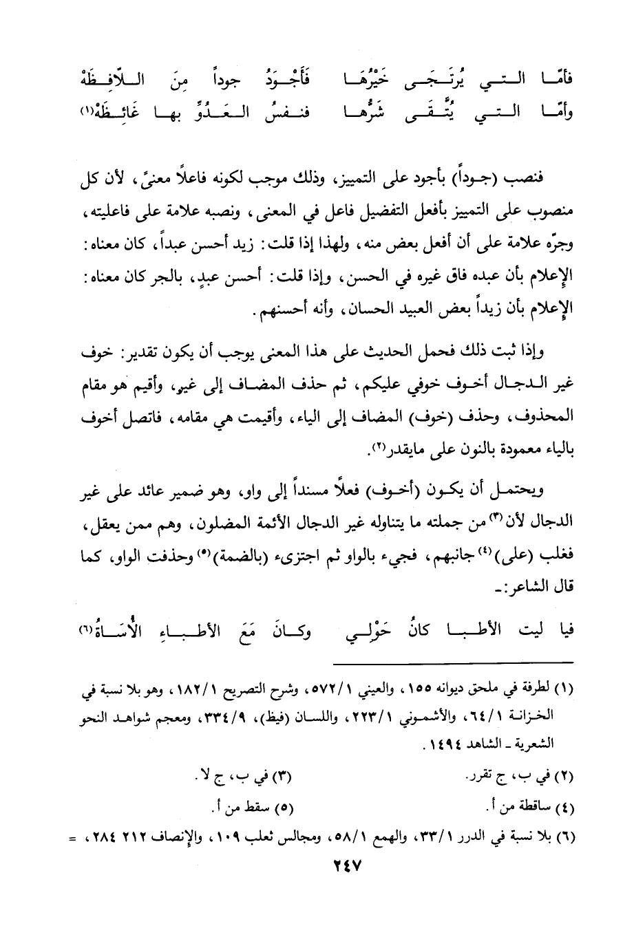 فنصب (جودًا) بأجود على التمييز، وذلك موجبٌ لكونه فاعلاً معنى؛ لأن كل منصوب على التمييز بأفعل التفضيل فاعل في المعنى، ونصبه علامة على فاعليته، وجرّه علامة على أنَّ أفعل بعض منه؛ ولهذا إذا قلت: زيد أحسن عبدًا، كان معناه: الإعلام بأن عبده فاق عبيد غيره في الحسن. وإذا قلت: أحسن عبدٍ – بالجر – كان معناه: الإعلام بأن زيدًا بعض العبيد الحسان، وأنه أحسنهم.