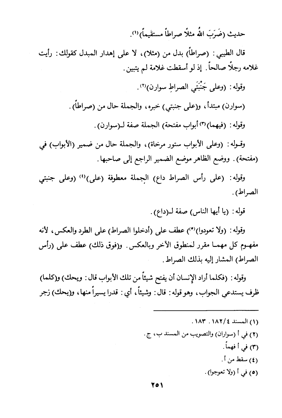 قال الطيبي: (صراطًا) بدل من (مثلاً)، لا على إهدار المبدل كقولك: رأيت غلامه رجلاً صالحًا. إذ لو أسقطت غلامه لم يتبين.