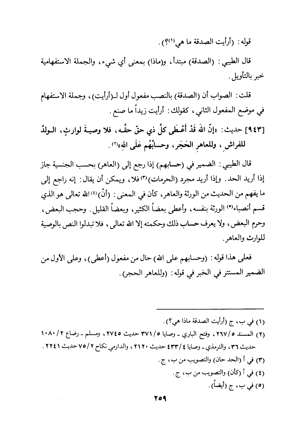 قال الطيبي: الضمير في (حسابهم) إذا رجع إلى (العاهر) بحسب الجنسية جاز إذا أريد الحد، وإذا أريد مجرد الحرمان فلا، ويمكن أن يقال: إنه راجع إلى ما يفهم من الحديث من الورثة والعاهر، كأن في المعنى: أن الله تعالى هو الذي قسم أنصباء الورثة بنفسه، فأعطى بعضًا الكثير، وبعضًا القليل، وحجب البعض وحرم البعض، ولا يعرف حساب ذلك وحكمته إلا الله تعالى، فلا تبدلوا النص بالوصية للوارث والعاهر.