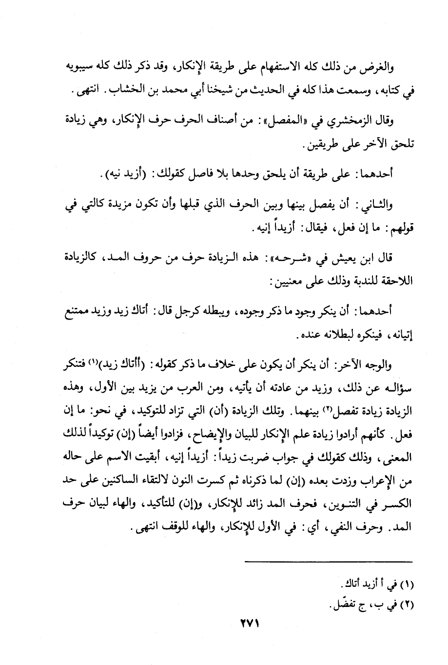 وقال الزمخشري في "المفصل": من أصناف الحرف حرف الإنكار، وهي زيادة تلحق الآخر على طريقين.