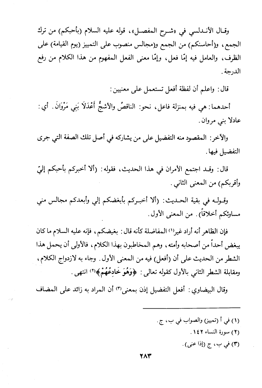فإن الظاهر أنه أراد غير المفاضلة كأنه قال: بغيضكم، فإنه عليه السلام ما كان يبغض أحدًا من أصحابه وأمته، وهم المخاطبون بهذا الكلام، فالأولى أن يحمل هذا الشطر من الحديث على أن (أفعل) فيه من المعنى الأول. وجاء به لازدواج الكلام، ومقابلة الشطر الثاني بالأول كقوله تعالى: (وهو خادعهم) [النساء: 142] انتهى.