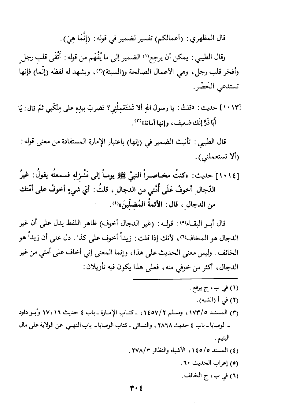 قال أبو البقاء: قوله: (غير الدجال أخوف) ظاهر اللفظ يدل على أن غير الدجال هو الخائف؛ لأنك إذا قلت: زيدًا أخوف على كذا، دل على أن زيدًا هو الخائف. وليس معنى الحديث على هذا، وإنما المعنى إني أخاف على أمتي من غير الدجال، أكثر من خوفي منه، فعلى هذا يكون فيه تأويلان: