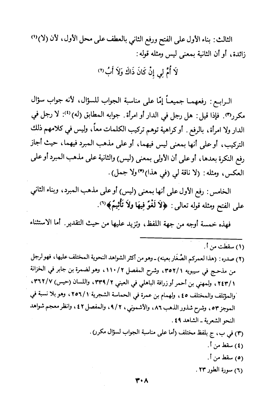 الخامس: رفع الأول على أنها بمعنى (ليس) أو على مذهب المبرد، وبناء الثاني على الفتح ومثله قوله تعالى: (لا لغوٌ فيها ولا تأثيمٌ) [الطور: 23].