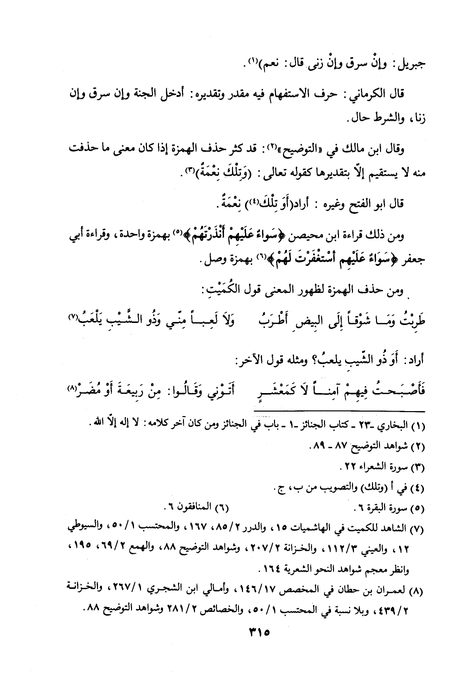 وقال ابن مالك في "التوضيح" قد كثر حذف الهمزة إذا كان معنى ما حذفت منه لا يستقيم إلا بتقديرها كقوله تعالى: (وتلك نعمة) [الشعراء: 22].