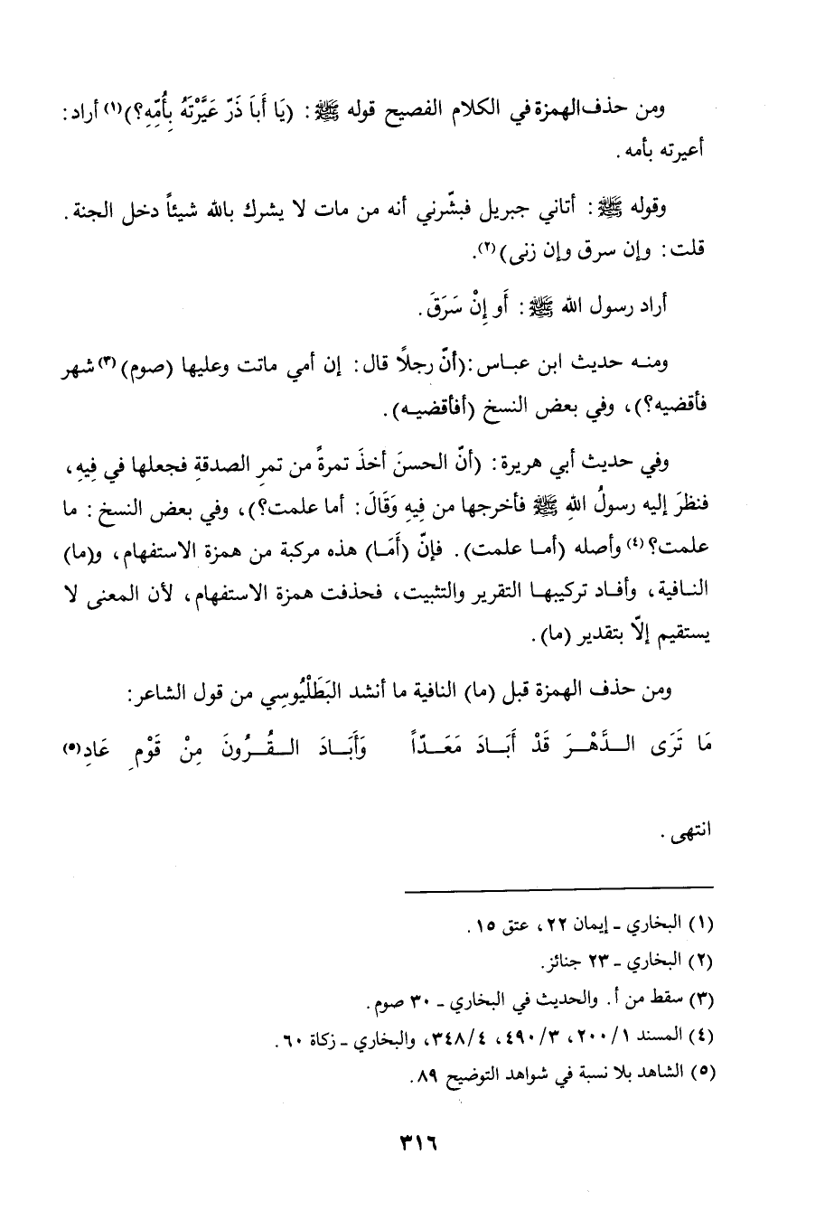 ومن حذف الهمزة في الكلام الفصيح قوله صلى الله عليه وسلم: (يا أبا ذر، عيرته بأمه؟). أراد: أعيرته بأمه.