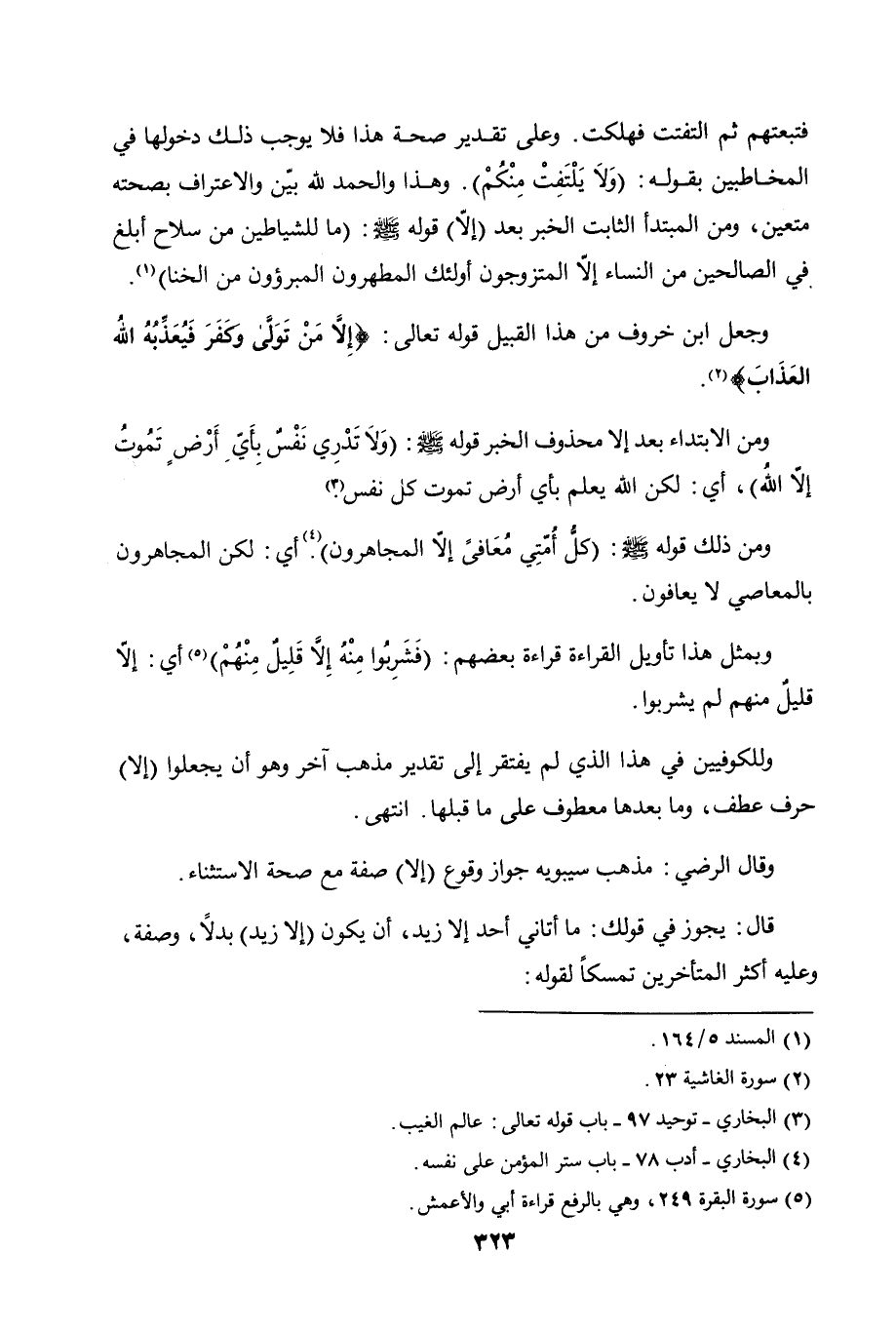 فتبعتهم ثم التفتت فهلكت. وعلى تقدير صحة هذا فلا يوجب ذلك دخولها في المخاطبين بقوله (ولا يلتفت منكم). وهذا والحمد لله بين، والاعتراف بصحته متعين. ومن المبتدأ الثابت الخبر بعد (إلا) قوله صلى الله عليه وسلم: (ما للشياطين من سلاح أبلغ في الصالحين من النساء إلا المتزوجون، أولئك المطهرون المبرؤون من الخنا).
