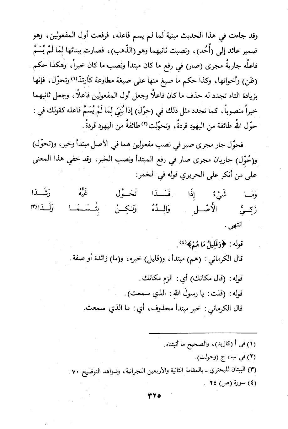 فحوّل جار مجرى صير في نصب مفعولين هما في الأصل مبتدأ وخبر، و (تحوّل) و (حُوِّل) جاريان مجرى صار في رفع المبتدأ ونصب الخبر، وقد خفي هذا المعنى على من أنكر على الحريري قوله في الخمر:
