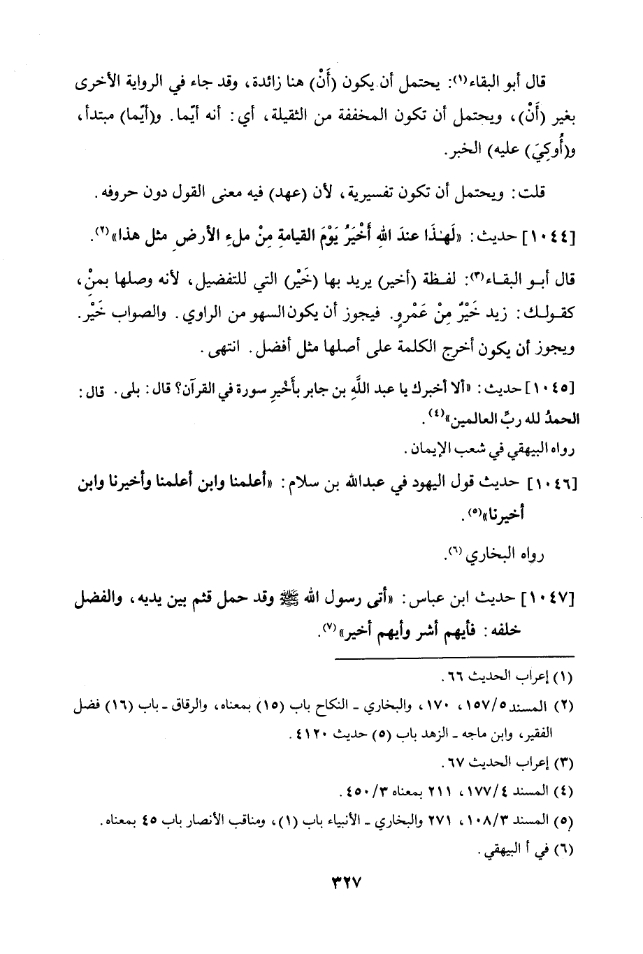 قال أبو البقاء: لفظة (أخير) يريد بها (خير) التي للتفضيل، لأنه وصلها بمنْ، كقولك: زيد خير من عمرو. فيجوز أن يكون السهو من الراوي، والصواب خير. ويجوز أن يكون أخرج الكلمة على أصلها مثل أفضل. انتهى.