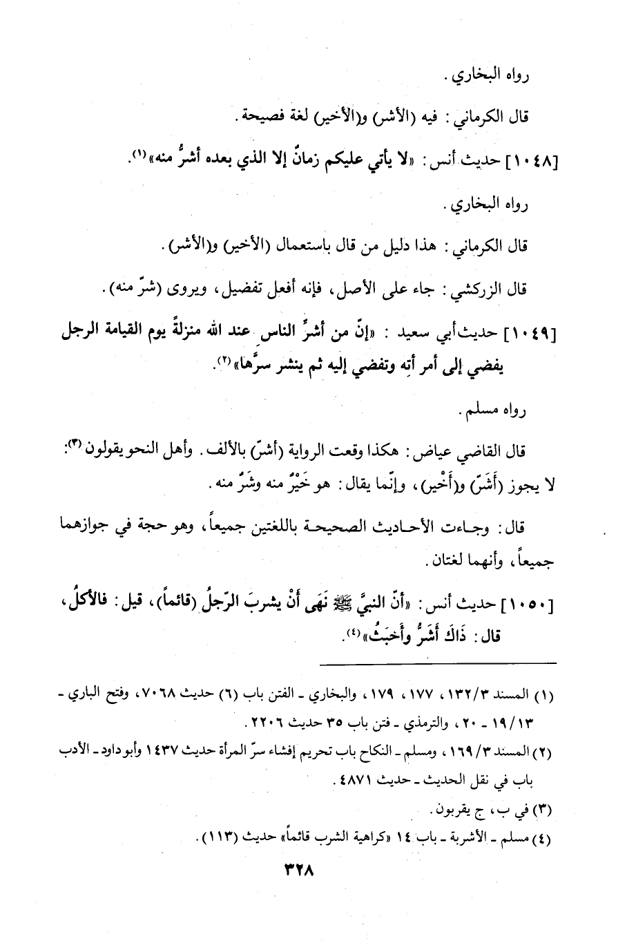 قال القاضي عياض: هكذا وقعت الرواية (أشرّ) بالألف. وأهل النحو يقولون: لا يجوز (أشرّ) و (أخير)، وإنما يقال: هو خير منه وشر منه.