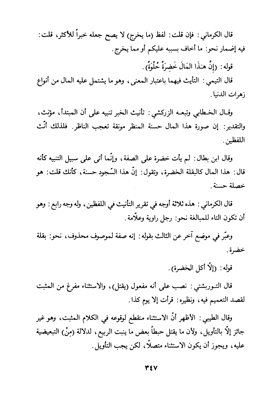 وقال الخطابي وتبعه الزركشي: تأنيث الخبر تنبيه على أن المبتدأ مؤنث، والتقدير: إن صورة هذا المال حسنة المنظر مونقة تعجب الناظر. فلذلك أنّث اللفظين.