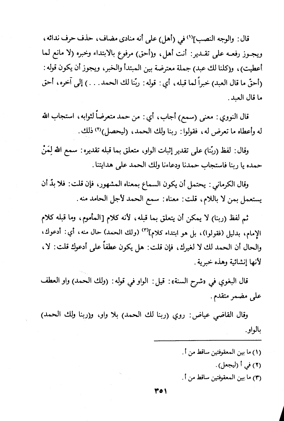 ثم لفظ (ربنا) لا يمكن أن يتعلق بما قبله، لأنه كلام المأموم وما قبله كلام الإمام، بدليل (فقولوا)، بل هو ابتداء كلام (ولك الحمد) حال منه، أي: أدعوك، والحال أن الحمد لك لا لغيرك، فإن قلت: هل يكون عطفًا على أدعوك قلت: لا، لأنها إنشائية وهذه خبرية.