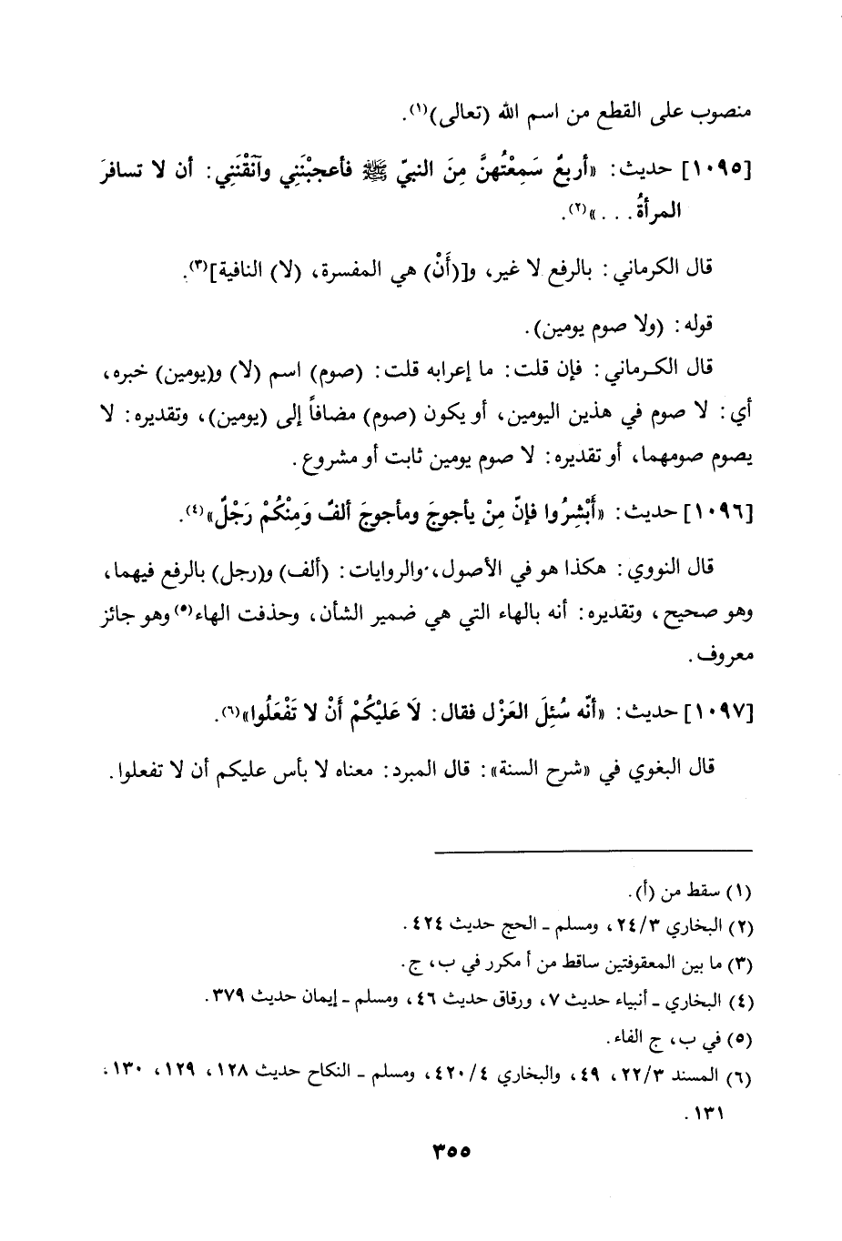 1095 - حديث: "أربعٌ سمعتهن من النبي صلى الله عليه وسلم فأعجبنني وآنقنني: أن لا تسافر المرأة ... ".