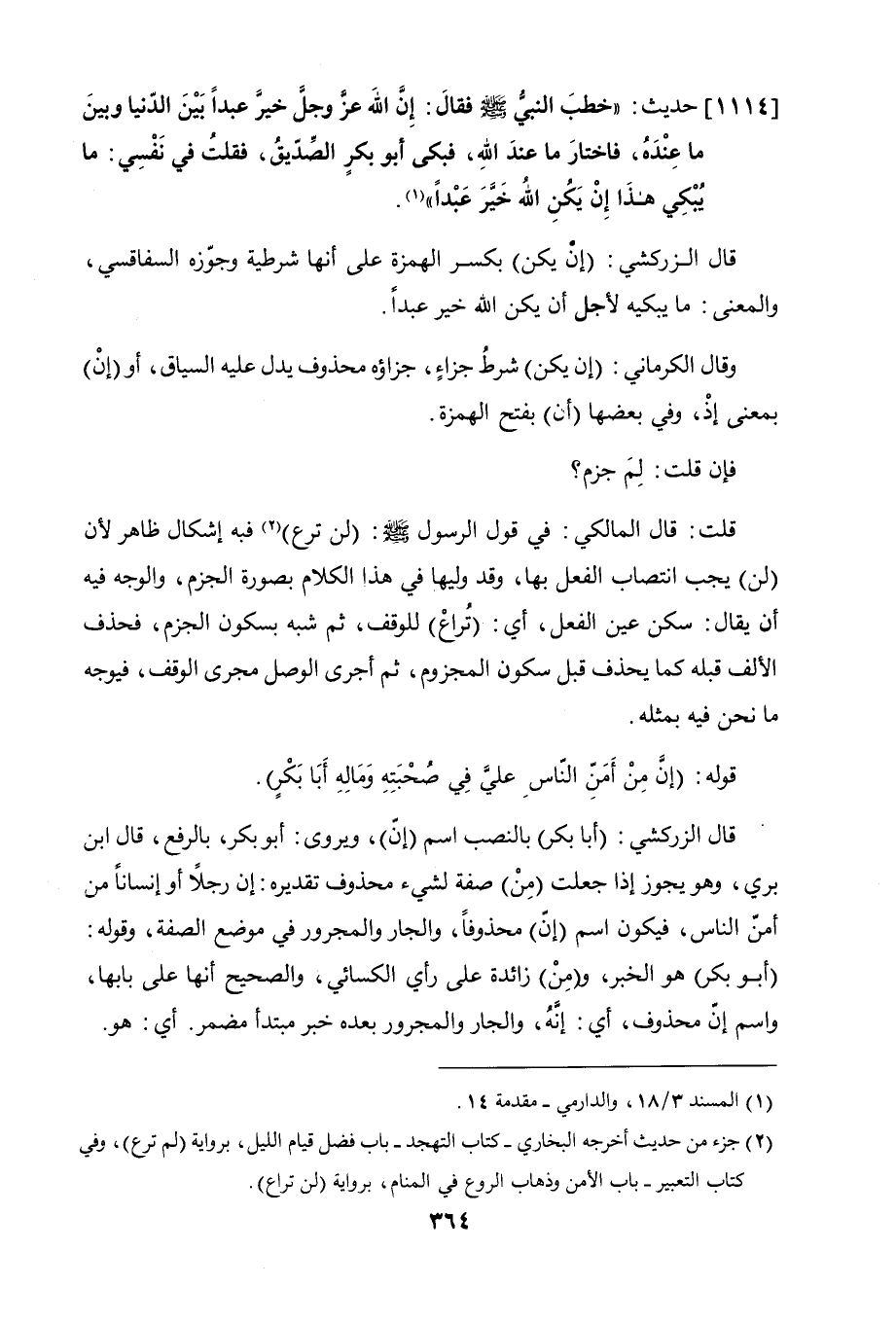 1114 - حديث: "خطب النبي صلى الله عليه وسلم فقال: إن الله عز وجل خير عبدًا بين الدنيا وبين ما عنده، فاختار ما عند الله، فبكى أبو بكر الصديق، فقلت في نفسي: ما يبكي هذا إن يكن الله خيَّر عبدًا".
