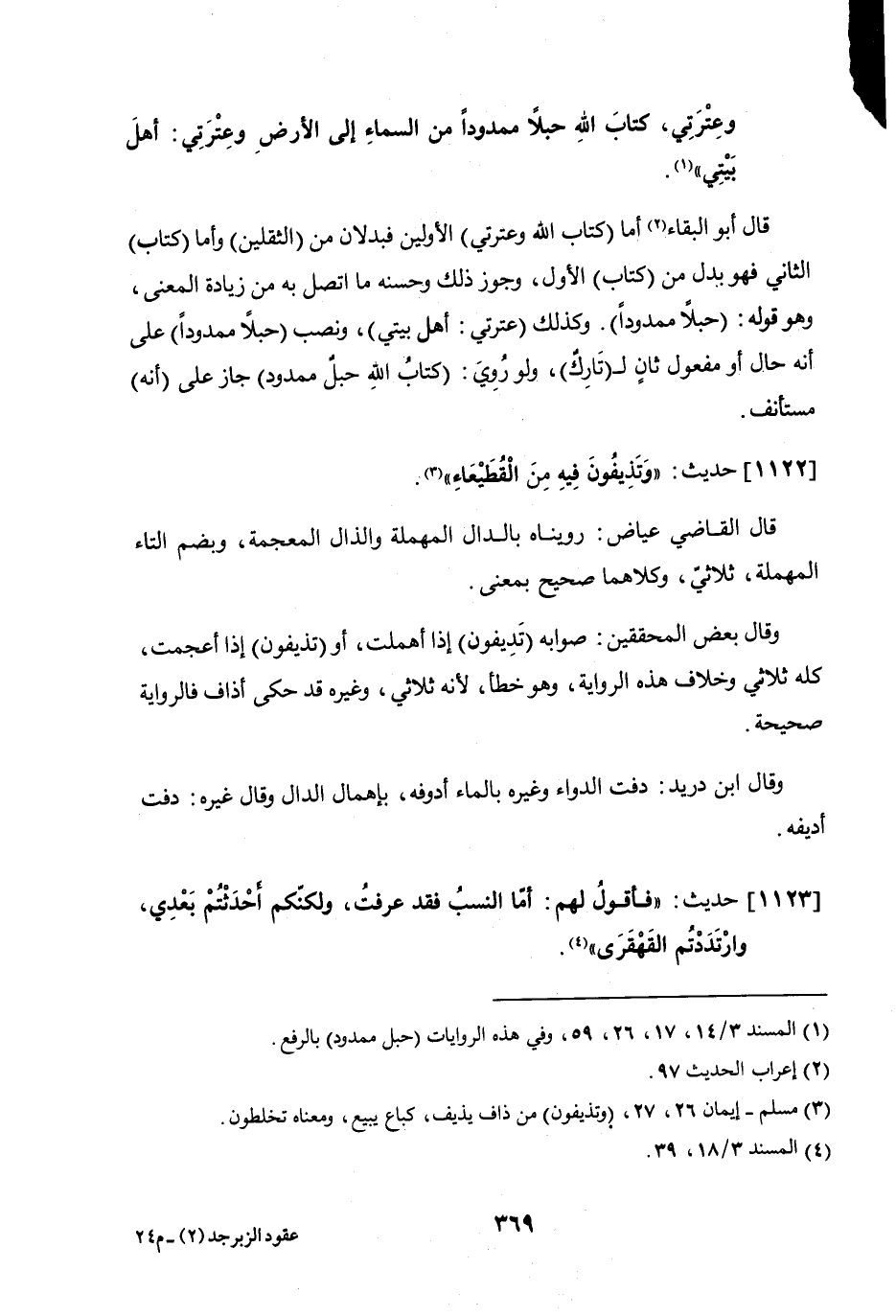 قال أبو البقاء: أما (كتاب الله وعترتي) الأولين فبدلان من (الثقلين) وأما (كتاب) الثاني فهو بدل من (كتاب) الأول، وجوز ذلك وحسنه ما اتصل به من زيادة المعنى، وهو قوله: (حبلاً ممدودًا). وكذلك (عترتي: أهل بيتي)، ونصب (حبلاً ممدودًا) على أنه حال أو مفعول ثانٍ لـ (تاركٌ)، ولو رُوِي: (كتابُ الله حبلٌ ممدود) جاز على أنه مستأنف.