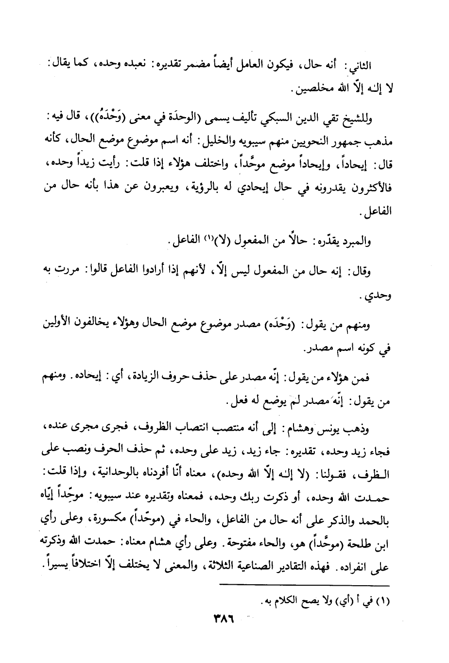 وللشيخ تقي الدين السبكي تأليف يسمى (الوحدَة في معنى (وحْدَهُ))، قال فيه: مذهب جمهور النحويين منهم سيبويه والخليل: أنه اسم موضوع الحال، كأنه قال: إيحادًا، وإيحادًا موضع موحَّدًا، واختلف هؤلاء إذا قلت: رأيت زيدًا وحده، فالأكثرون يقدرونه في حال إيحادي له بالرؤية، ويعبرون عن هذا بأنه حال من الفاعل.