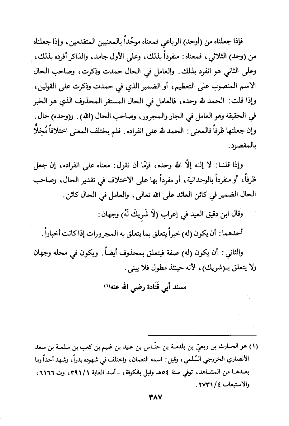فإذا جعلناه من (أوحد) الرباعي فمعناه موحّدًا بالمعنيين المتقدمين، وإذا جعلناه من (وحد) الثلاثي، فمعناه: منفردًا بذلك، وعلى الأول جامد، والذاكر أفرده بذلك، وعلى الثاني هو انفرد بذلك. والعامل في الحال حمدت وذكرت، وصاحب الحال الاسم المنصوب على التعظيم، أو الضمير الذي في حمدت وذكرت على القولين، وإذا قلت: الحمد لله وحده، فالعامل في الحال المستقر المحذوف الذي هو الخبر في الحقيقة وهو العامل في الجار والمجرور، وصاحب الحال (الله). و (وحده) حال. وإن جعلتها ظرفًا فالمعنى: الحمد لله على انفراده. فلم يختلف المعنى اختلافًا مخلاًّ بالمقصود.