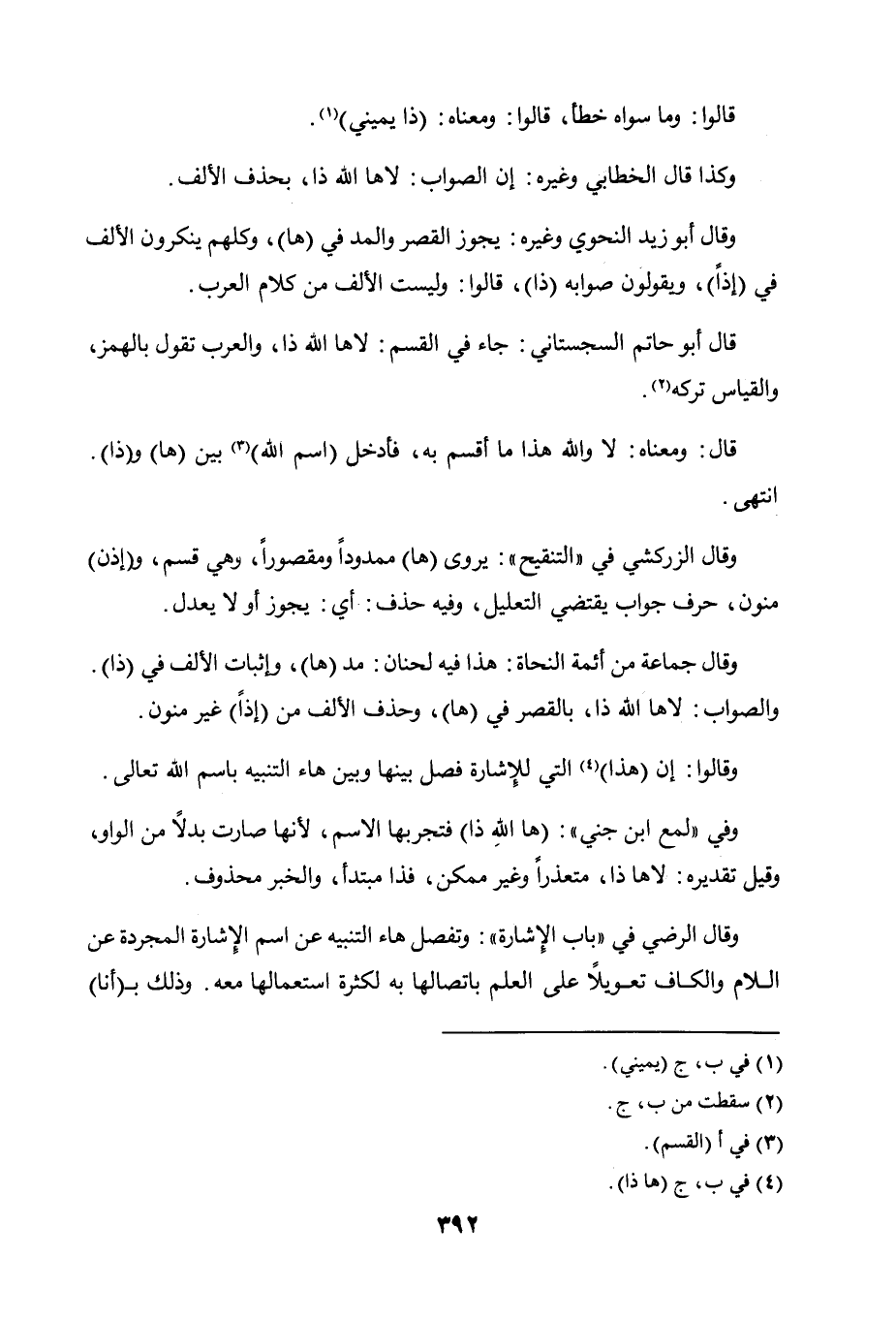وقال جماعة من أئمة النحاة: هذا فيه لحنان: مد (ها)، وإثبات الألف في (ذا) والصواب: لاها الله ذا، بالقصر في (ها)، وحذف الألف من (إذًا) غير منون.